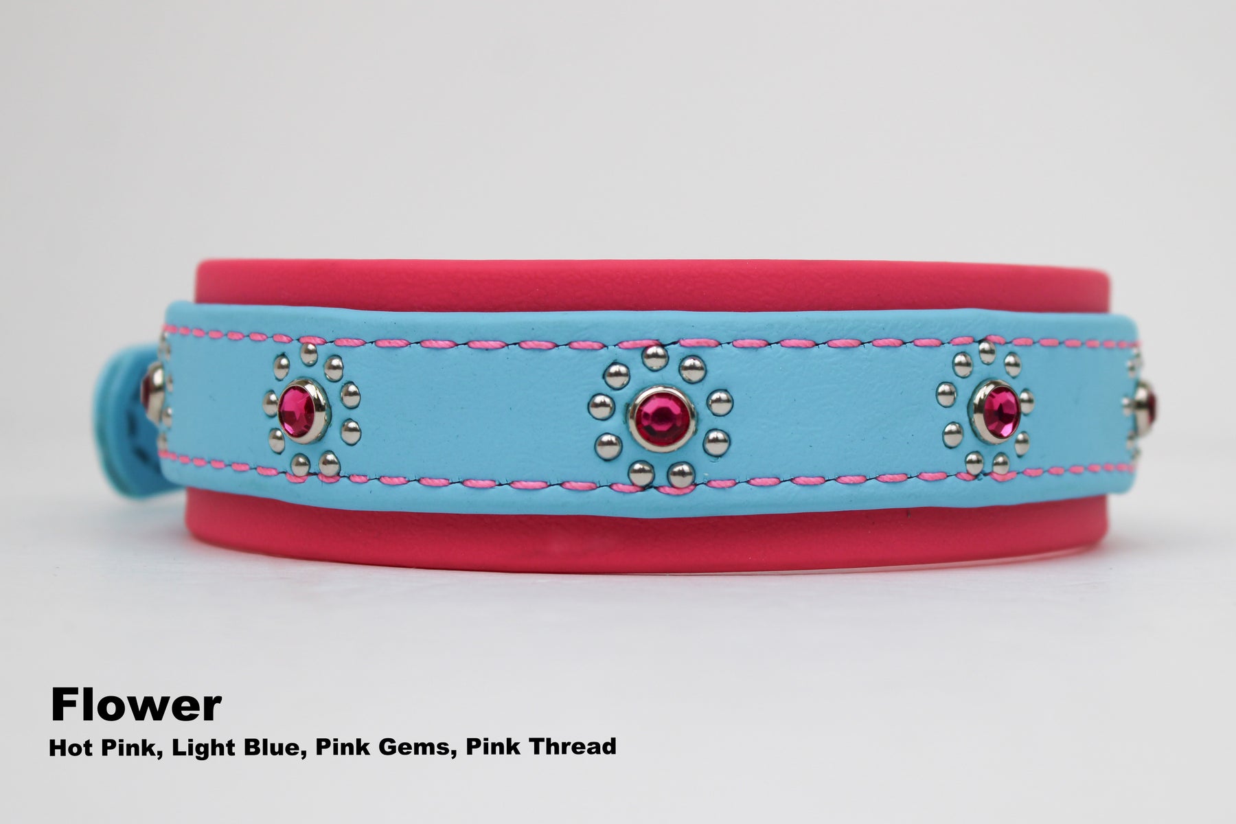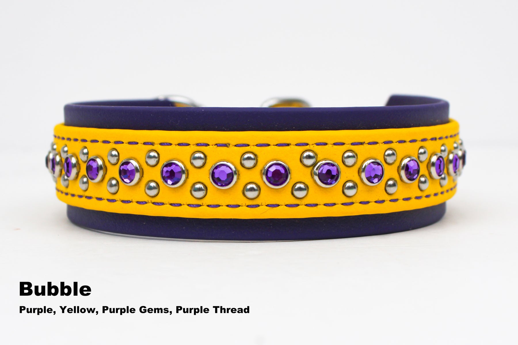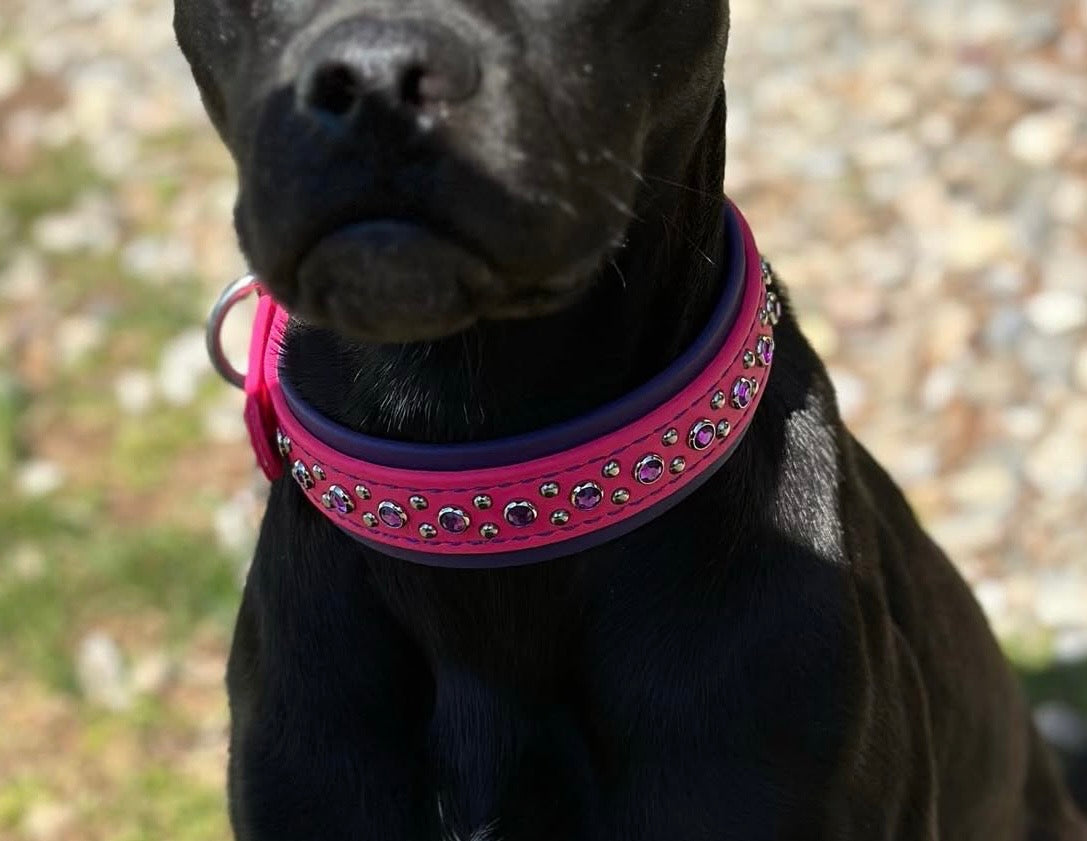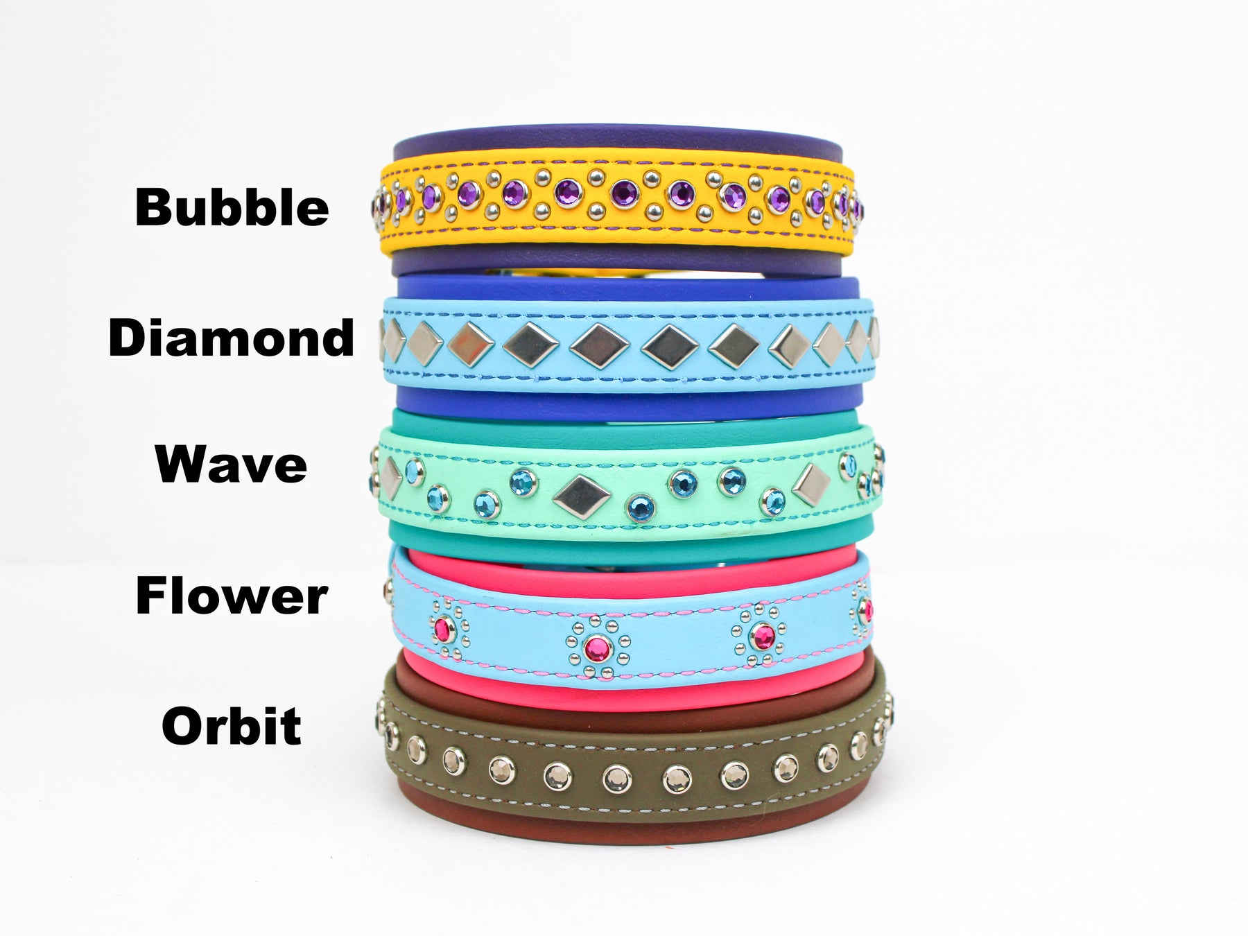 Our BioThane Bling Collars are made from the same original BioThane as our other products, with a little sparkle! They are easy to clean, durable and waterproof. We use BioThane Beta 520 Super Heavy material.