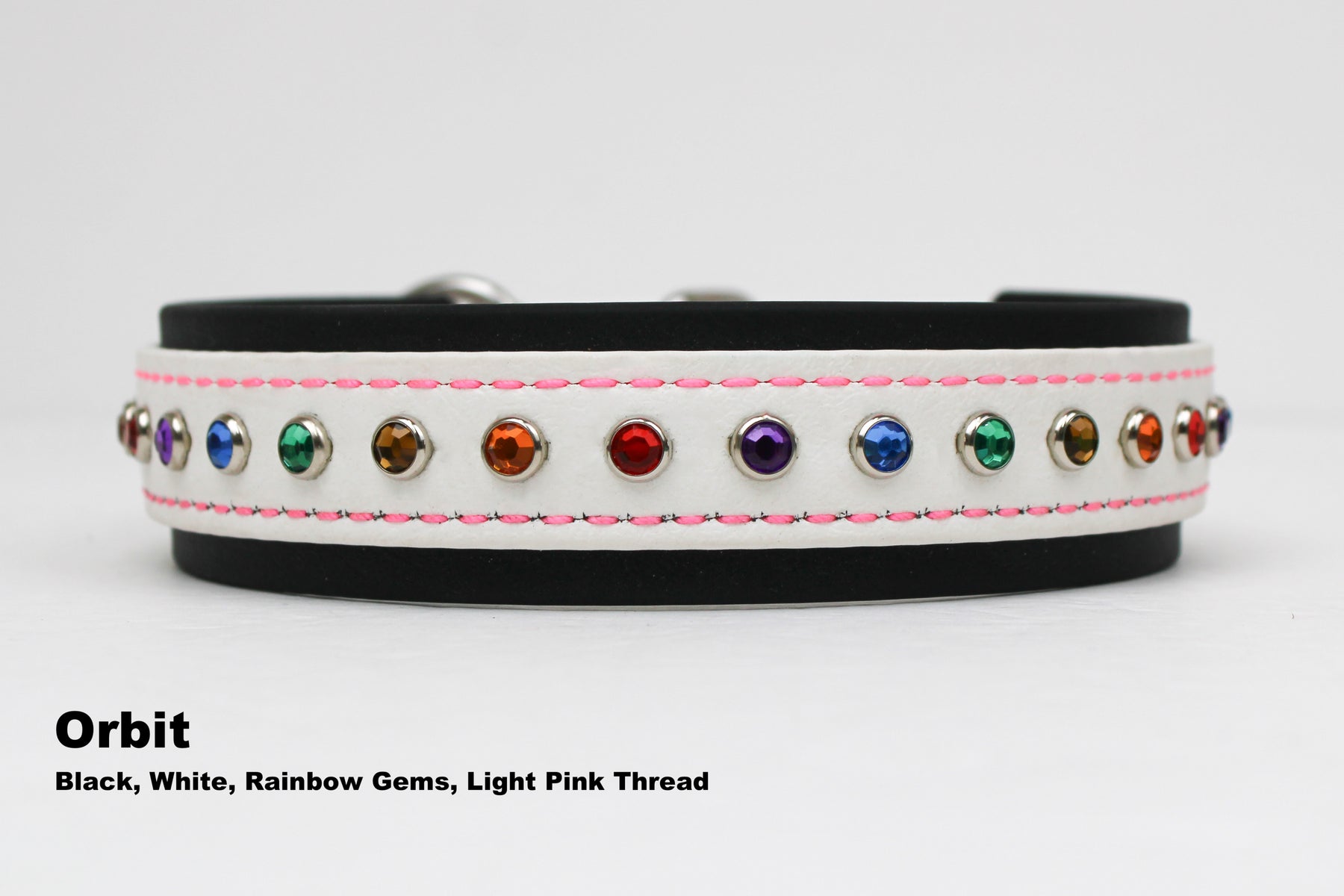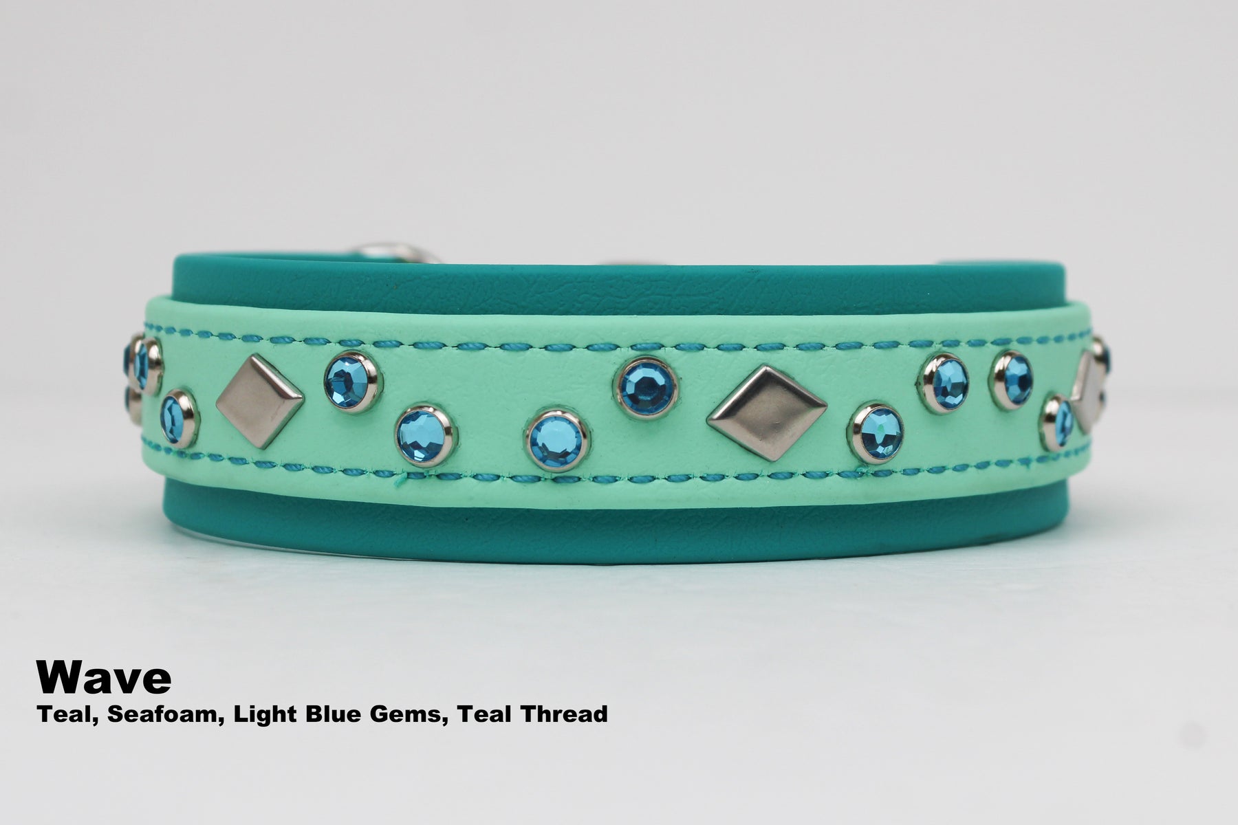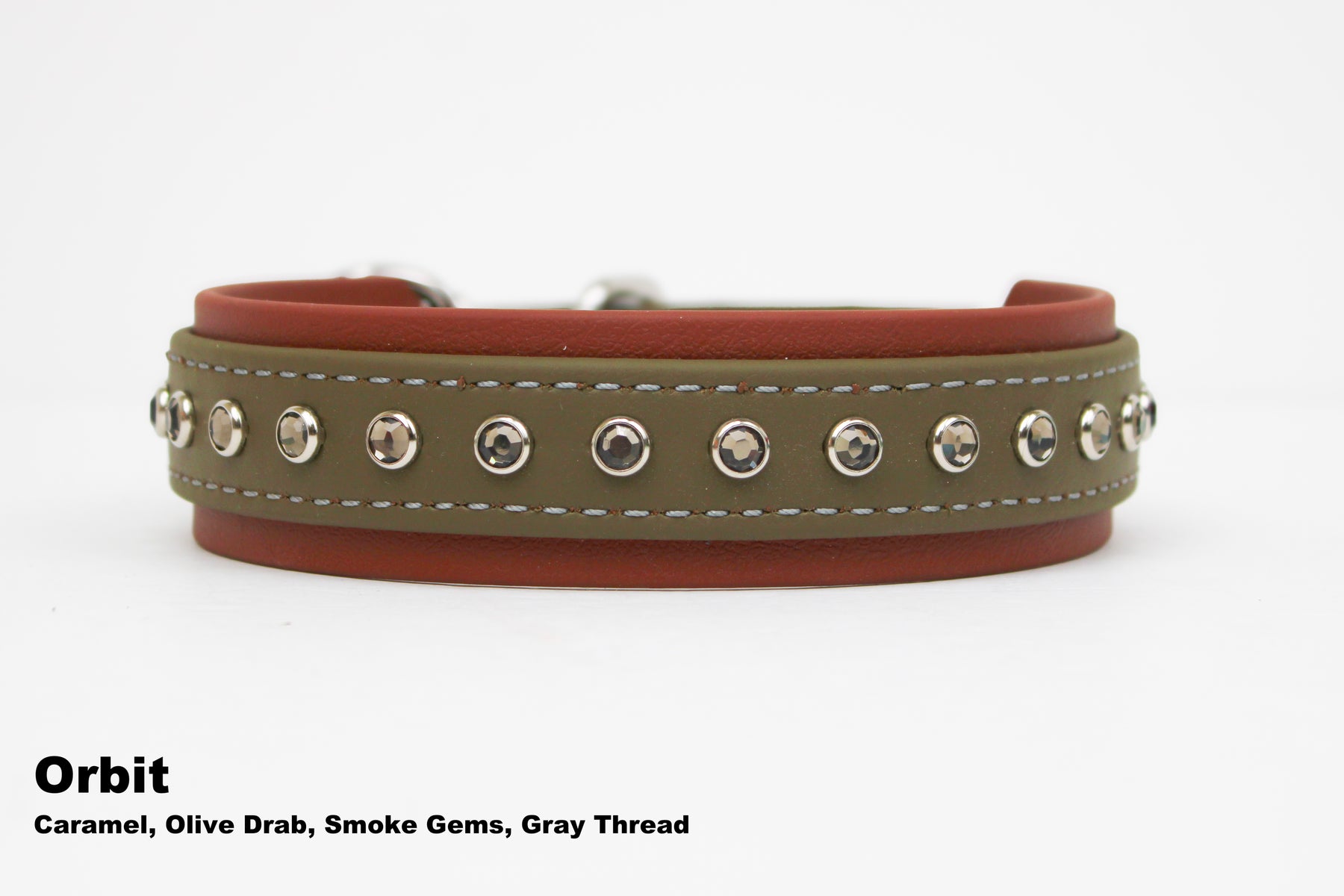 Our BioThane Bling Collars are made from the same original BioThane as our other products, with a little sparkle! They are easy to clean, durable and waterproof. We use BioThane Beta 520 Super Heavy material.