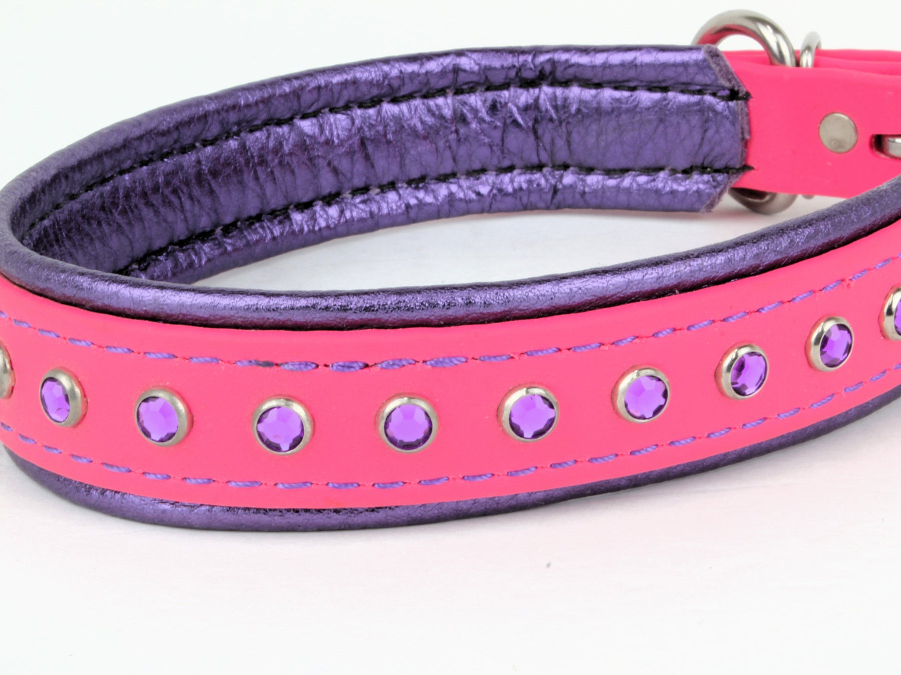 Our BioThane w/Leather Bling Collars are made from the same original BioThane as our other products, with a little sparkle!  They are easy to clean, durable and waterproof.  We use BioThane Beta 520 Super Heavy material with a soft leather backing.