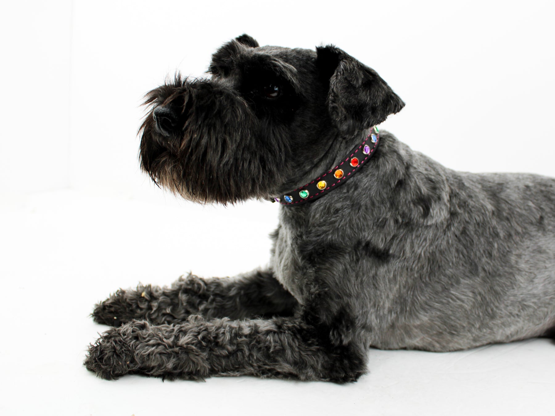 Each one is custom made to order so please allow two weeks for shipping. We also offer matching leads. Questions on sizing? For these collars, please measure at line #3 on the dog silhouette. Our BioThane MiniBling collars are sized to the middle hole, for example a 20" collar will fit 18"-22". For more info visit our sizing page!