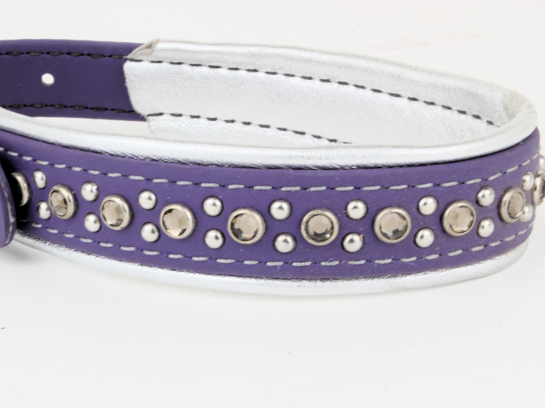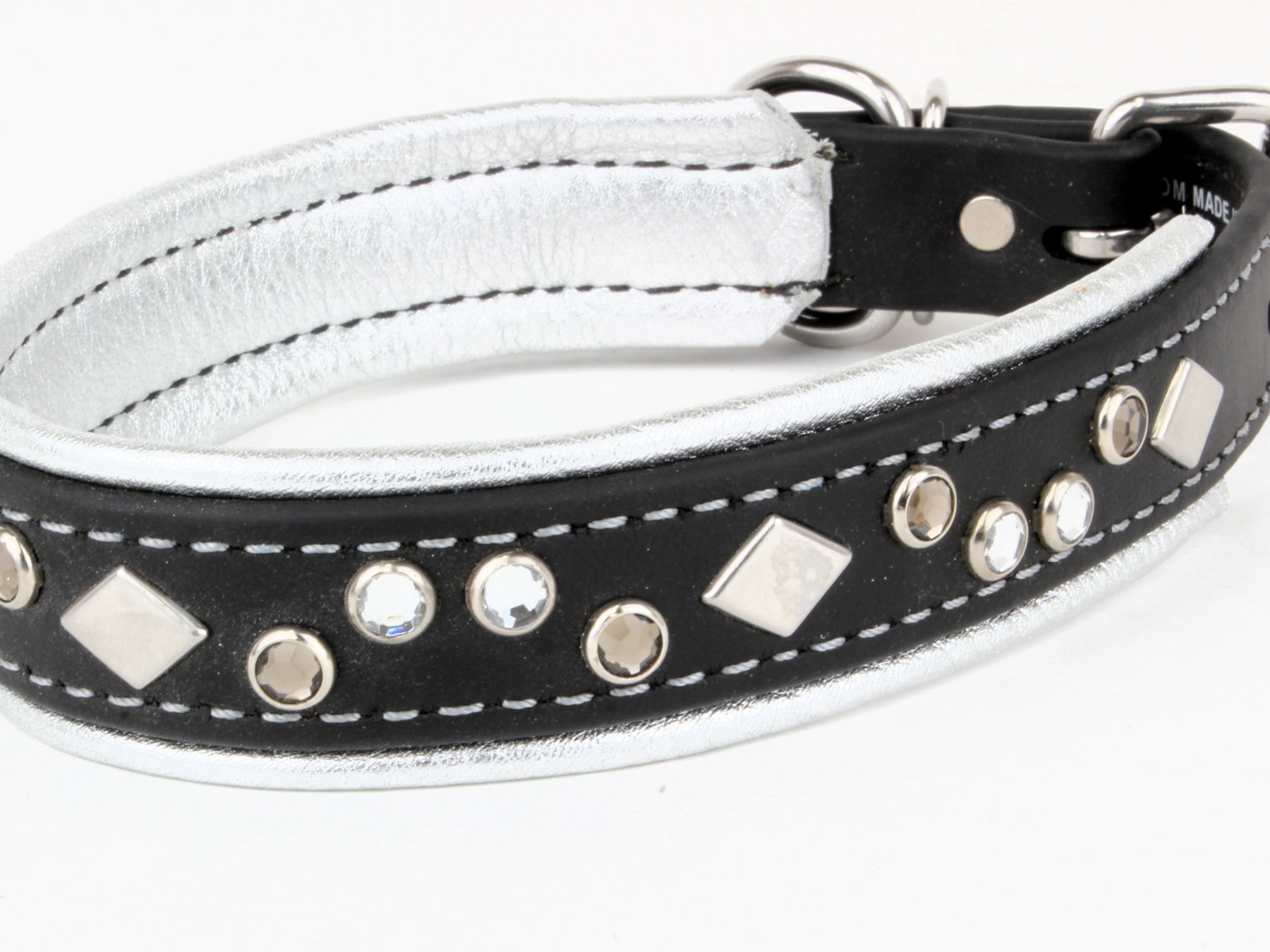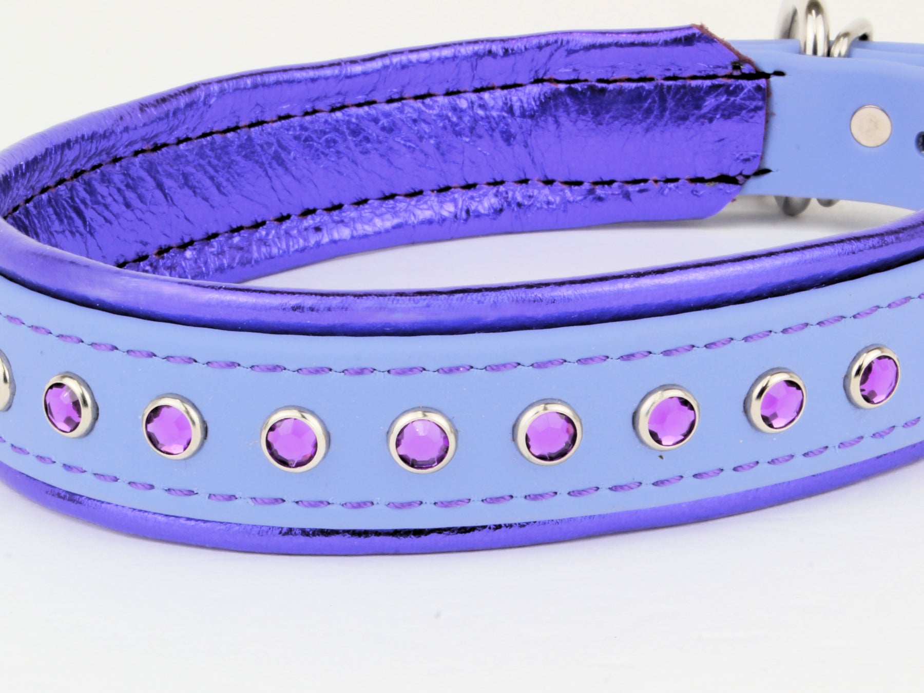 Our BioThane w/Leather Bling Collars are made from the same original BioThane as our other products, with a little sparkle!  They are easy to clean, durable and waterproof.  We use BioThane Beta 520 Super Heavy material with a soft leather backing.