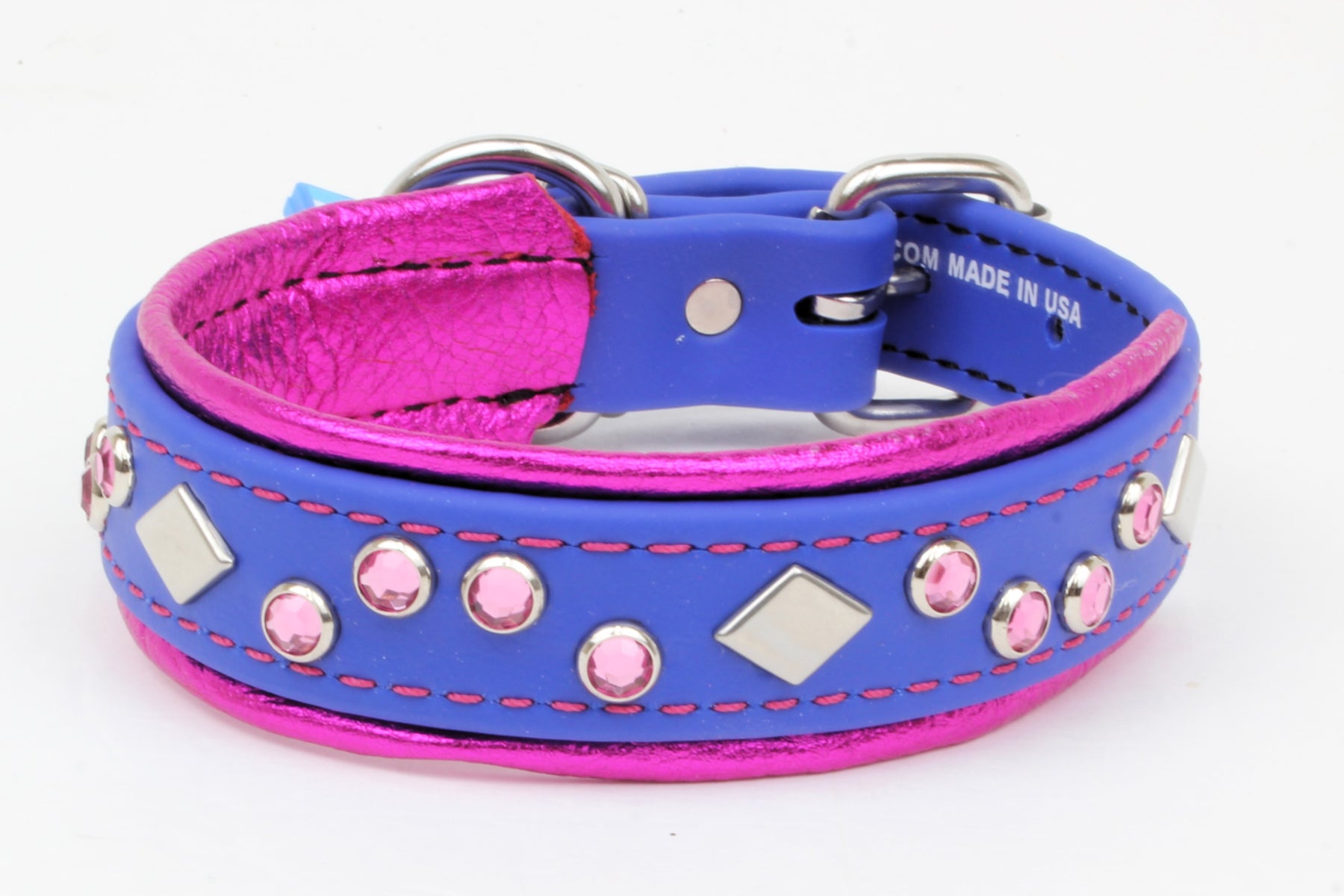 In Stock BioThane w/Leather Bling Collars are pre-made and ready to ship!