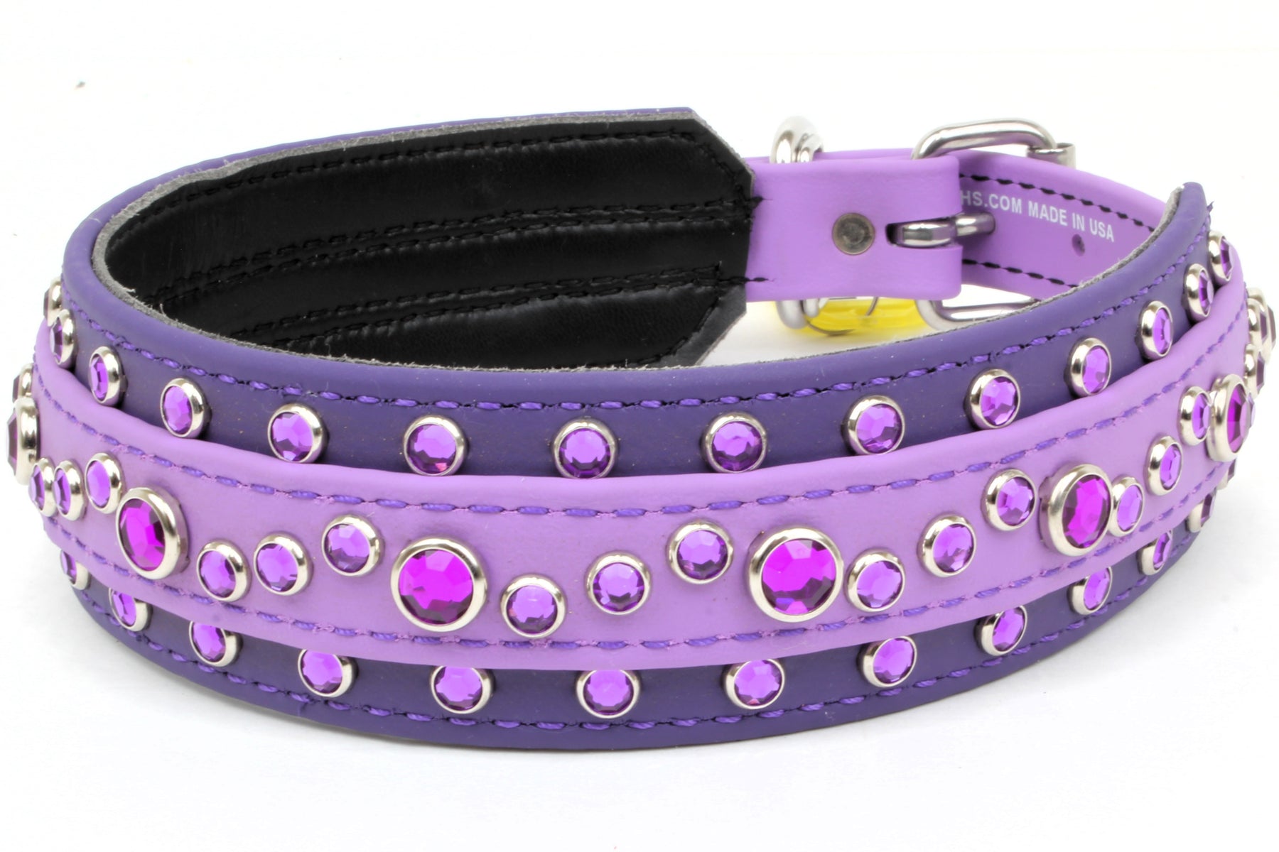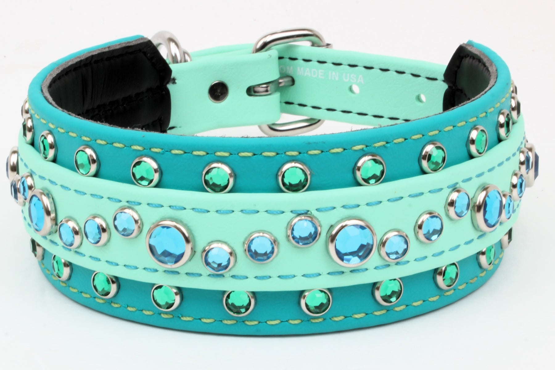 Our BioThane MegaBling Collars  are made from the same original BioThane as our other products, with sparkle!  They are easy to clean, durable and waterproof.  We use BioThane Beta 520 Super Heavy material.  Because of the additional biothane and Bling,  BioThane MegaBling Collars are a heavier collar and not for a small dog. 2" x 20" (fits 18"-22")