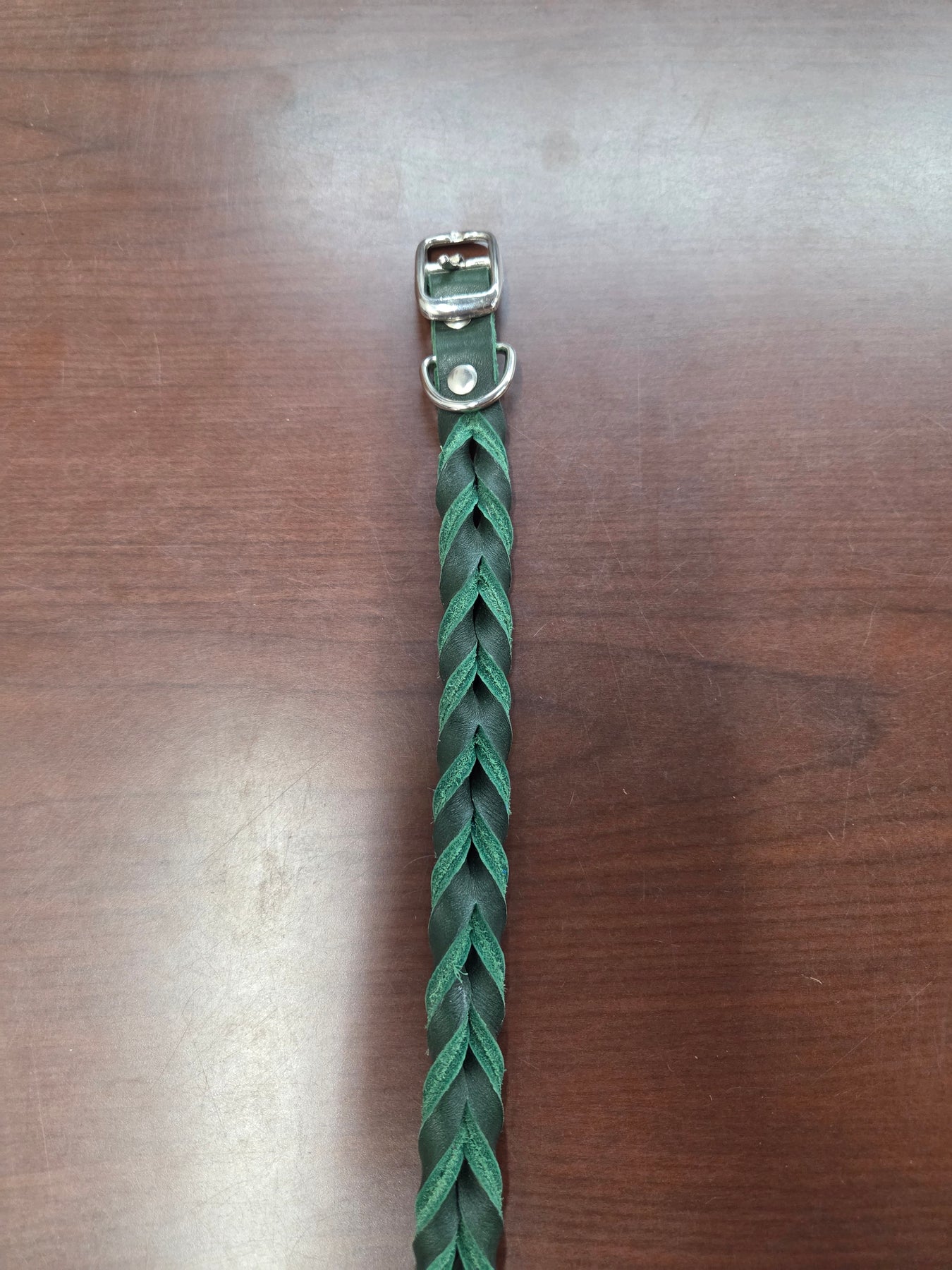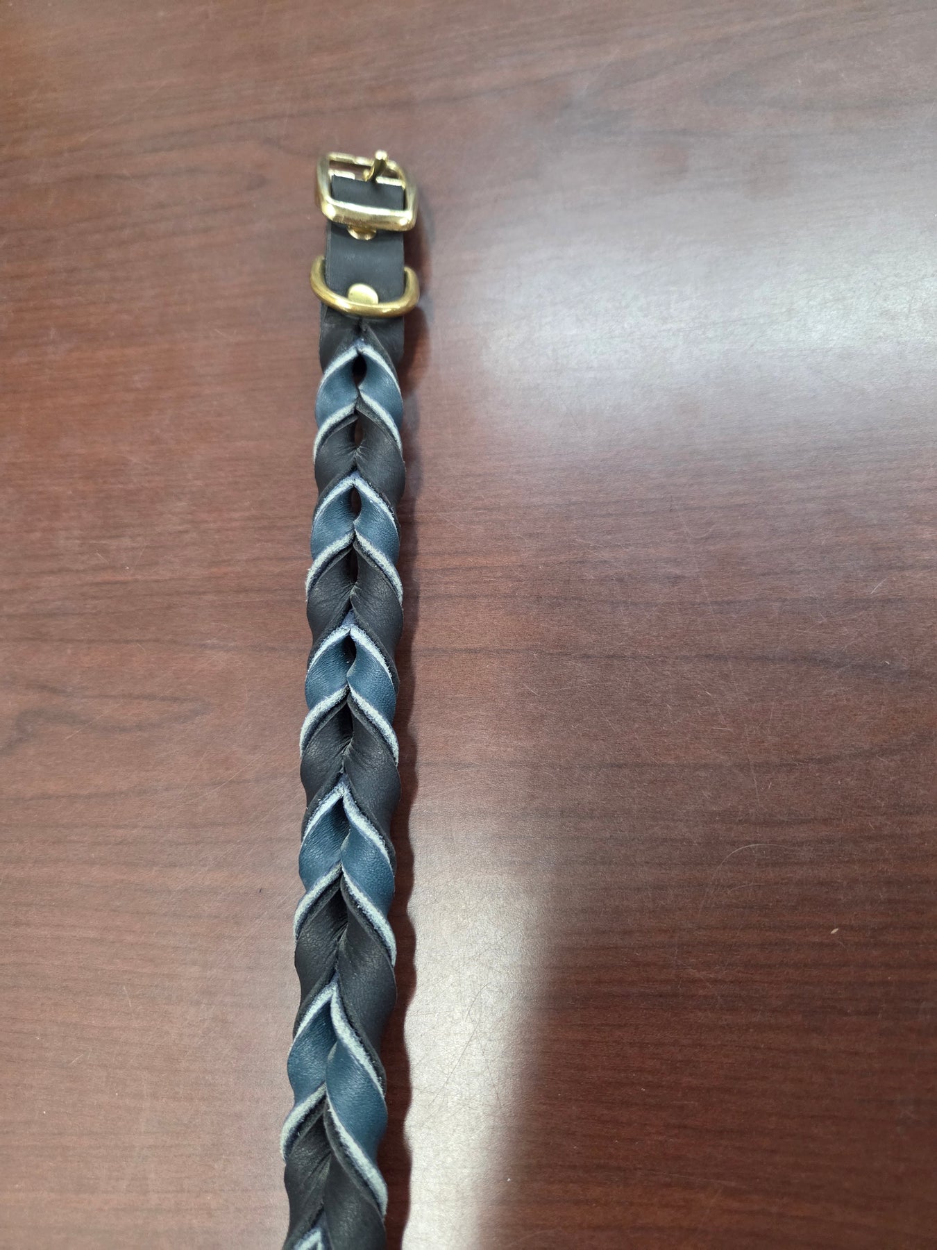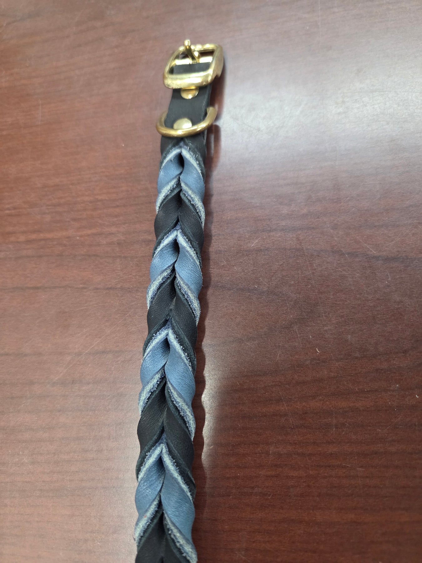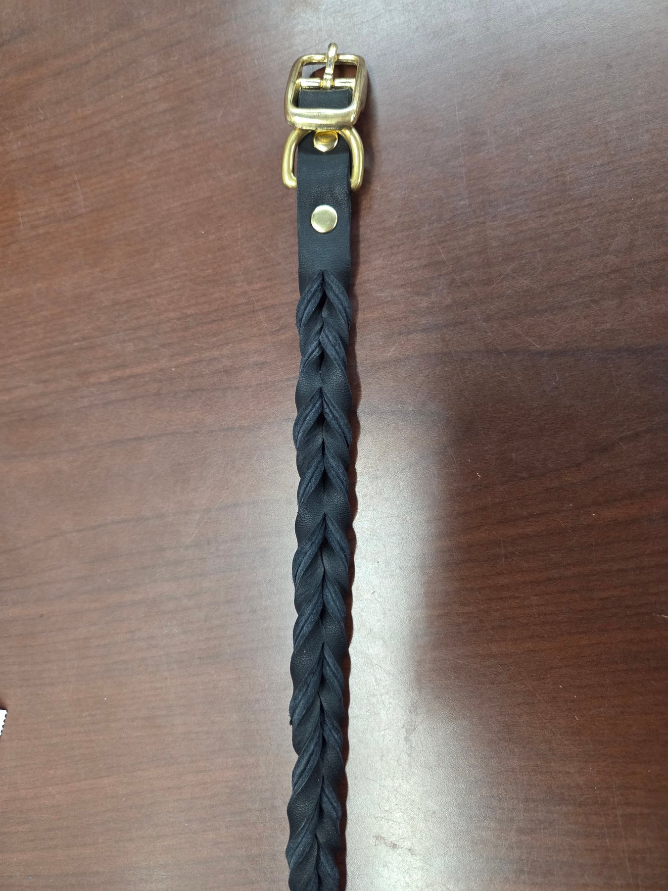 Shop worn = tarnished buckles and rivets.  In stock only.  The Leather Braided collars are sized by the last hole.