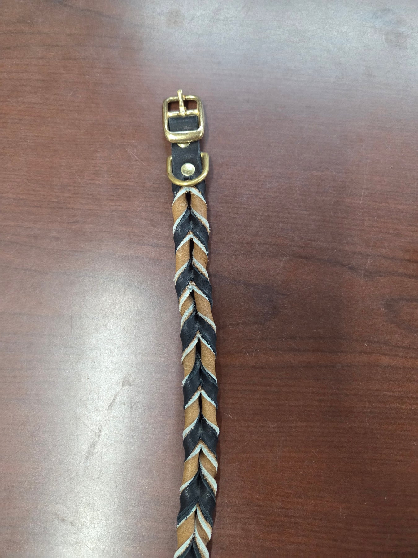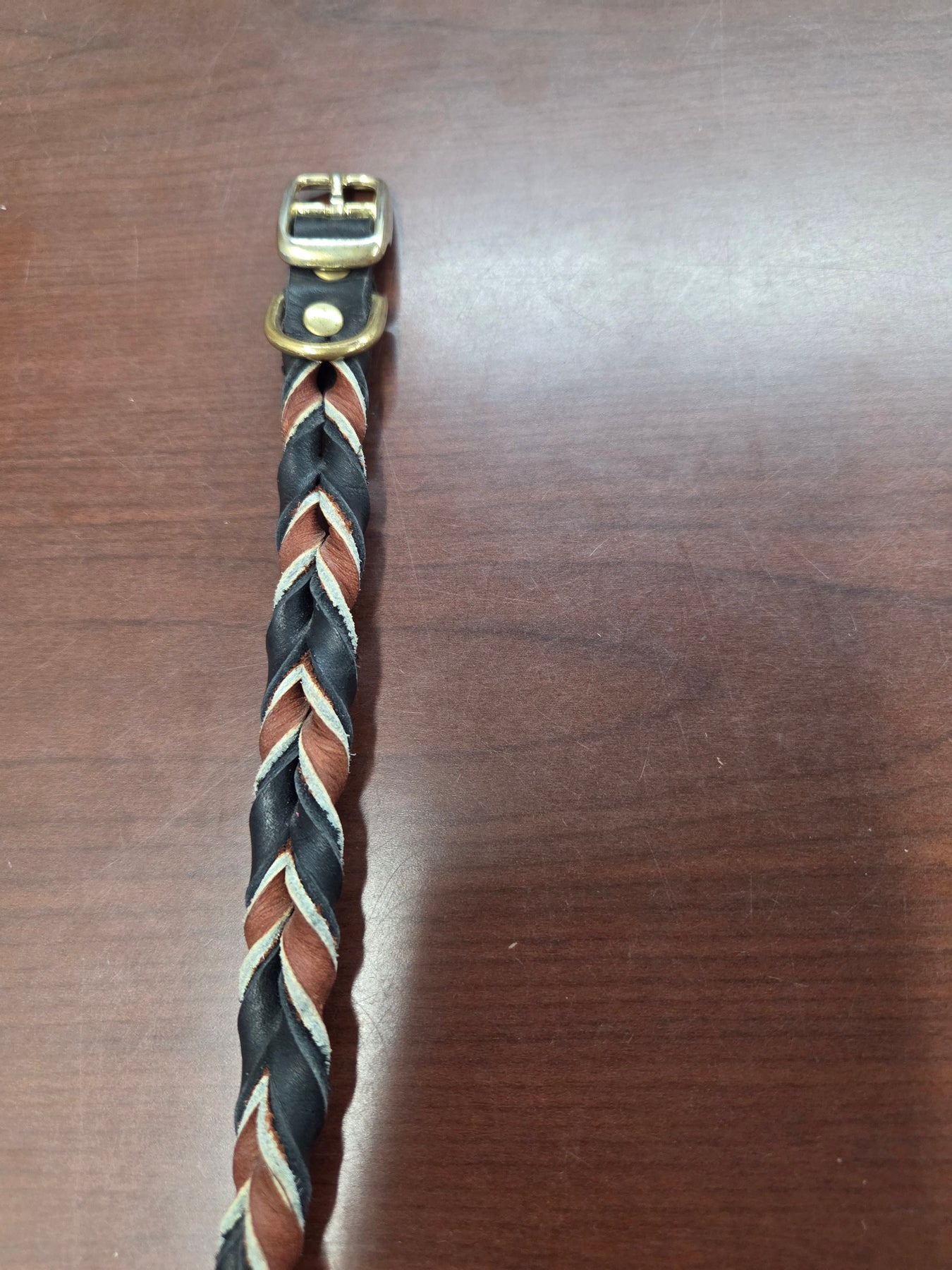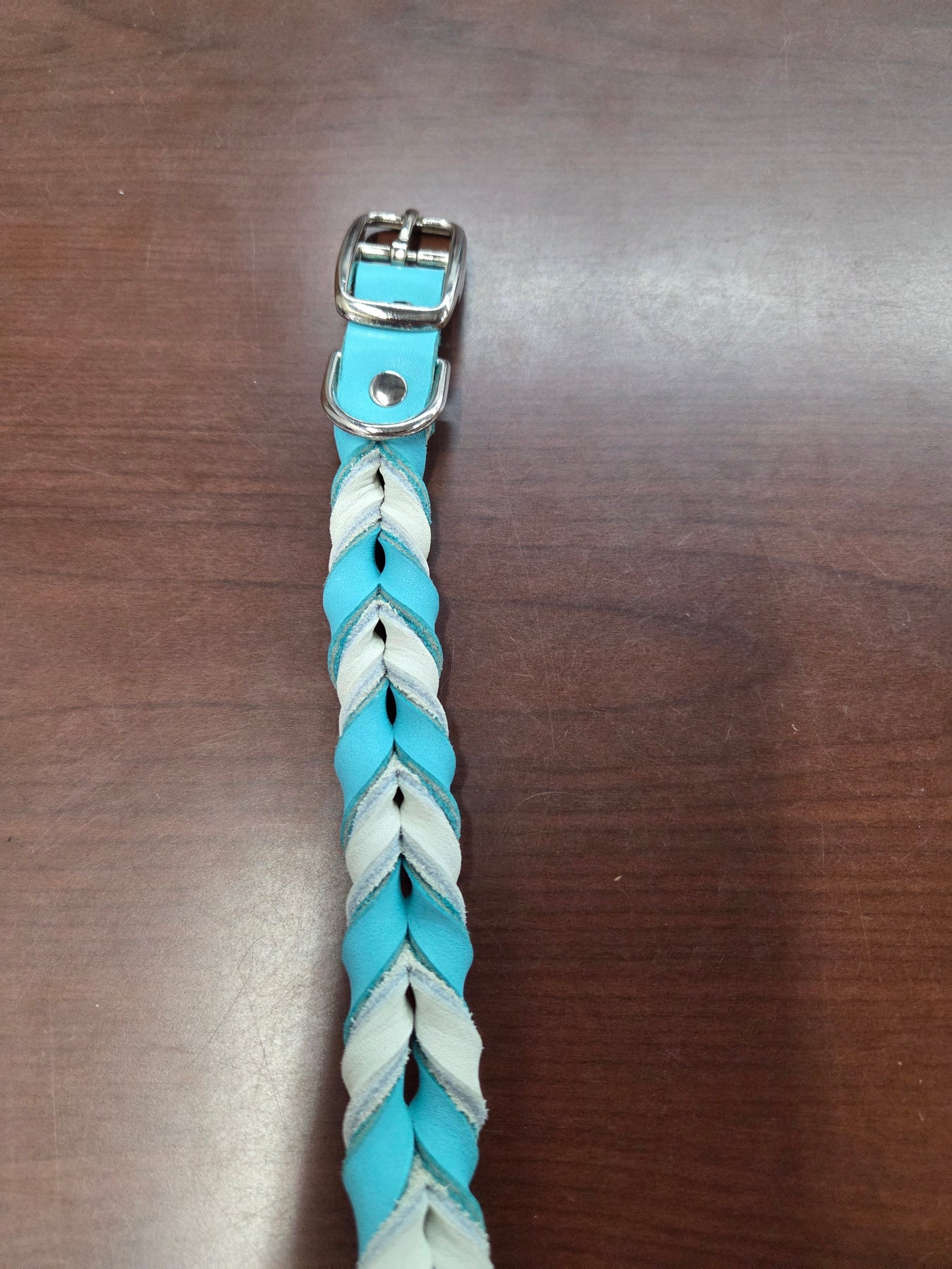 Shop worn = tarnished buckles and rivets.  In stock only.  The Leather Braided collars are sized by the last hole.
