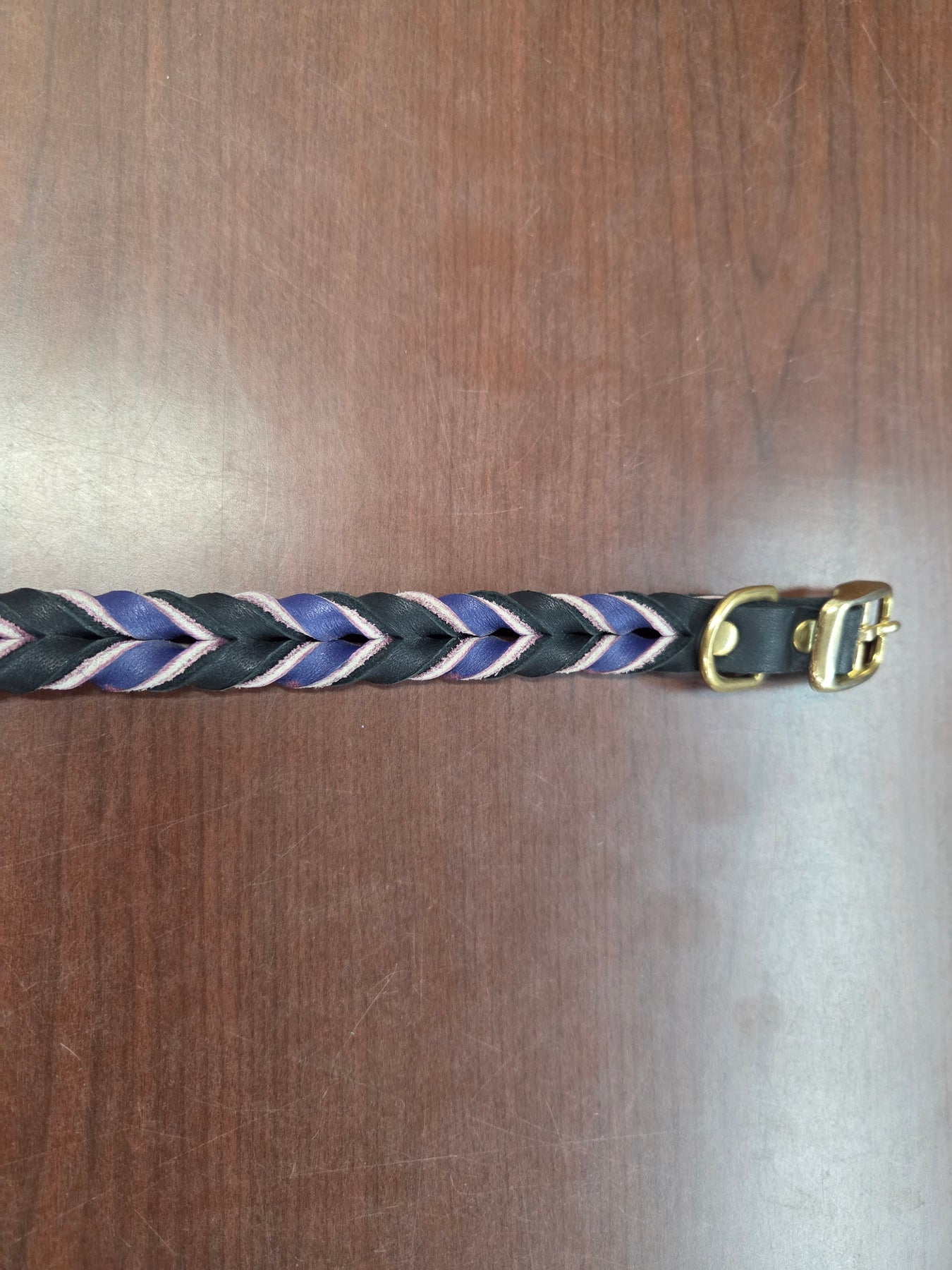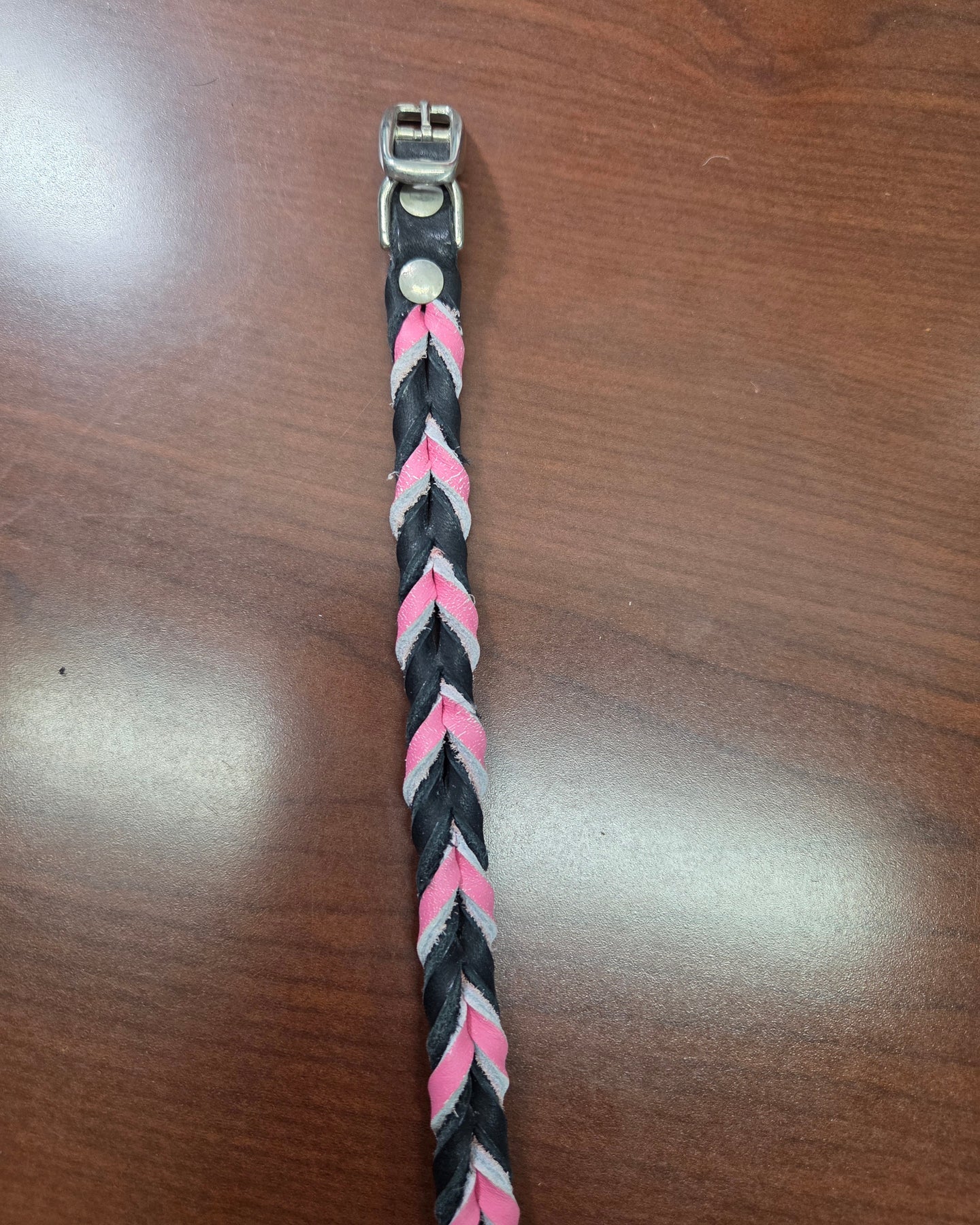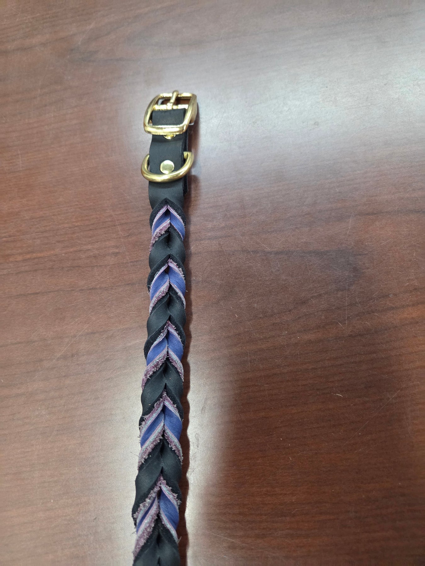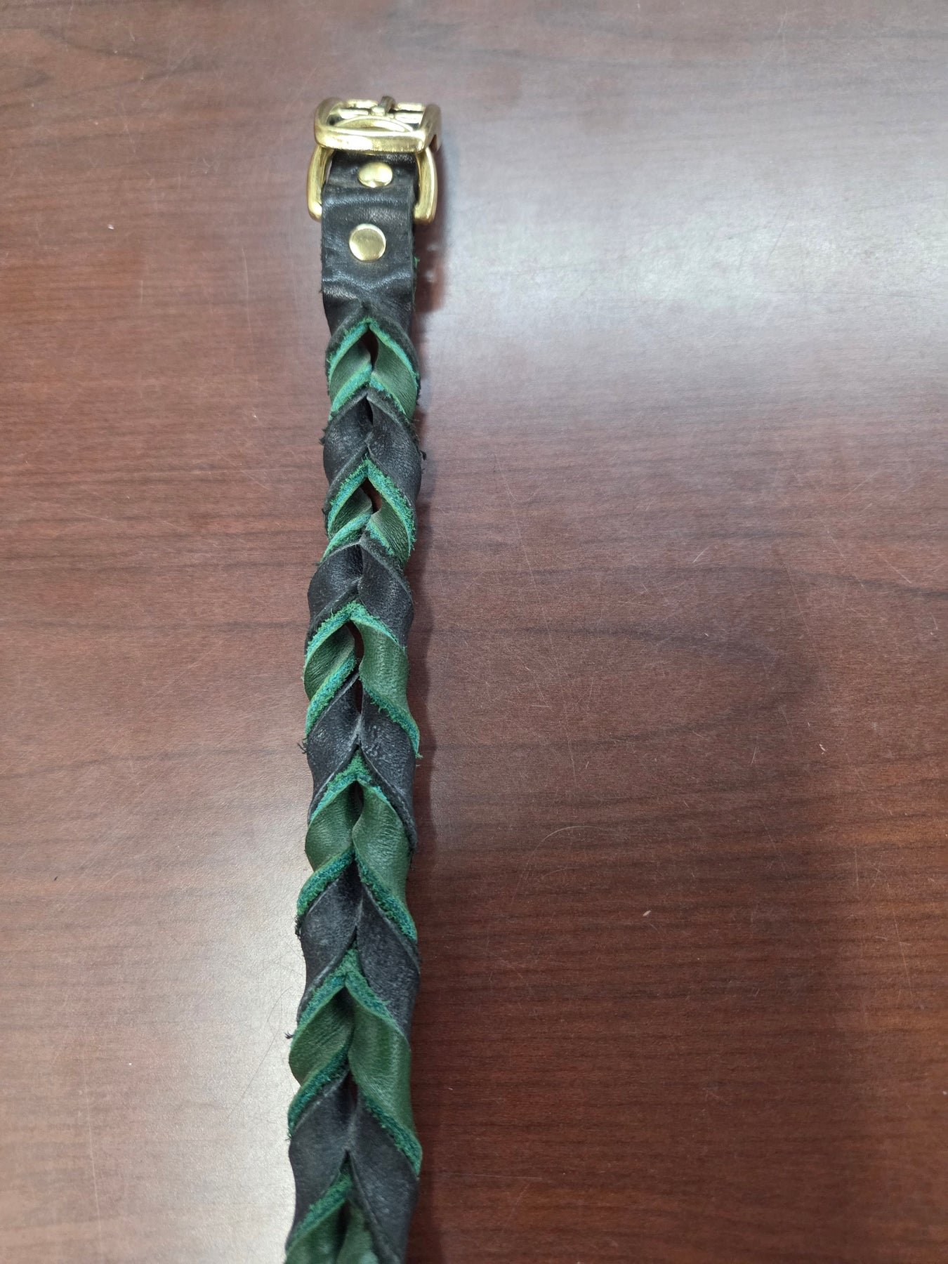 Shop worn = tarnished buckles and rivets.  In stock only.  The Leather Braided collars are sized by the last hole.