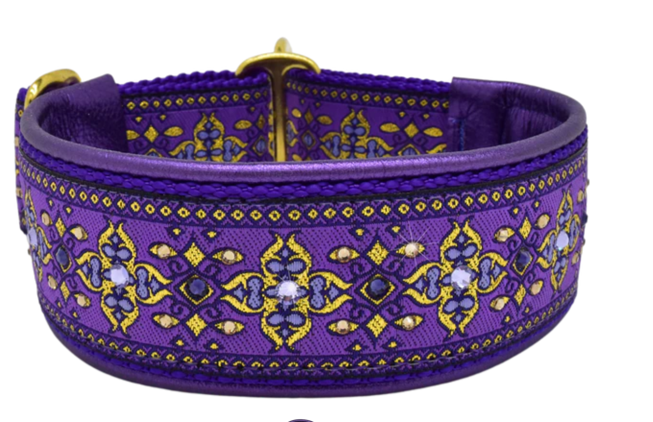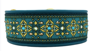 A dog wearing a FuzzyWumpets 1.5" Wide Hidden Prong Collars w/Crystals attending a palace ball wouldn't look out of place in this collar. This is not an everyday collar, but a piece of art for special events. The Hidden Prong Collar is backed in buttery garment-grade leather. Crystals make it royal. Spot clean as needed. These are adjustable and have a buckle- no need to slip over the dog's head! Measure around the widest part of the head, line one in the diagram. Available in standard sizes. Machine wash, line dry.