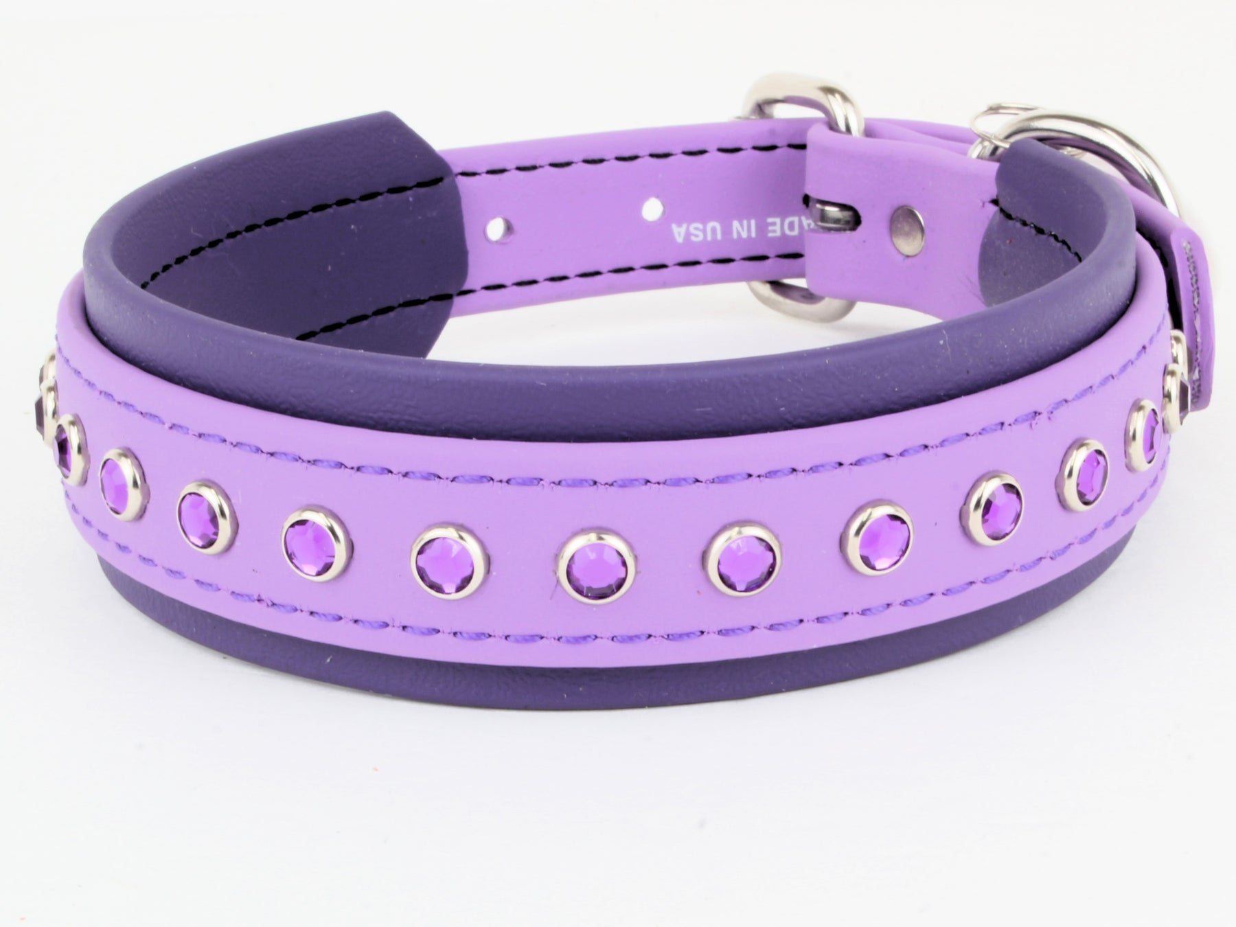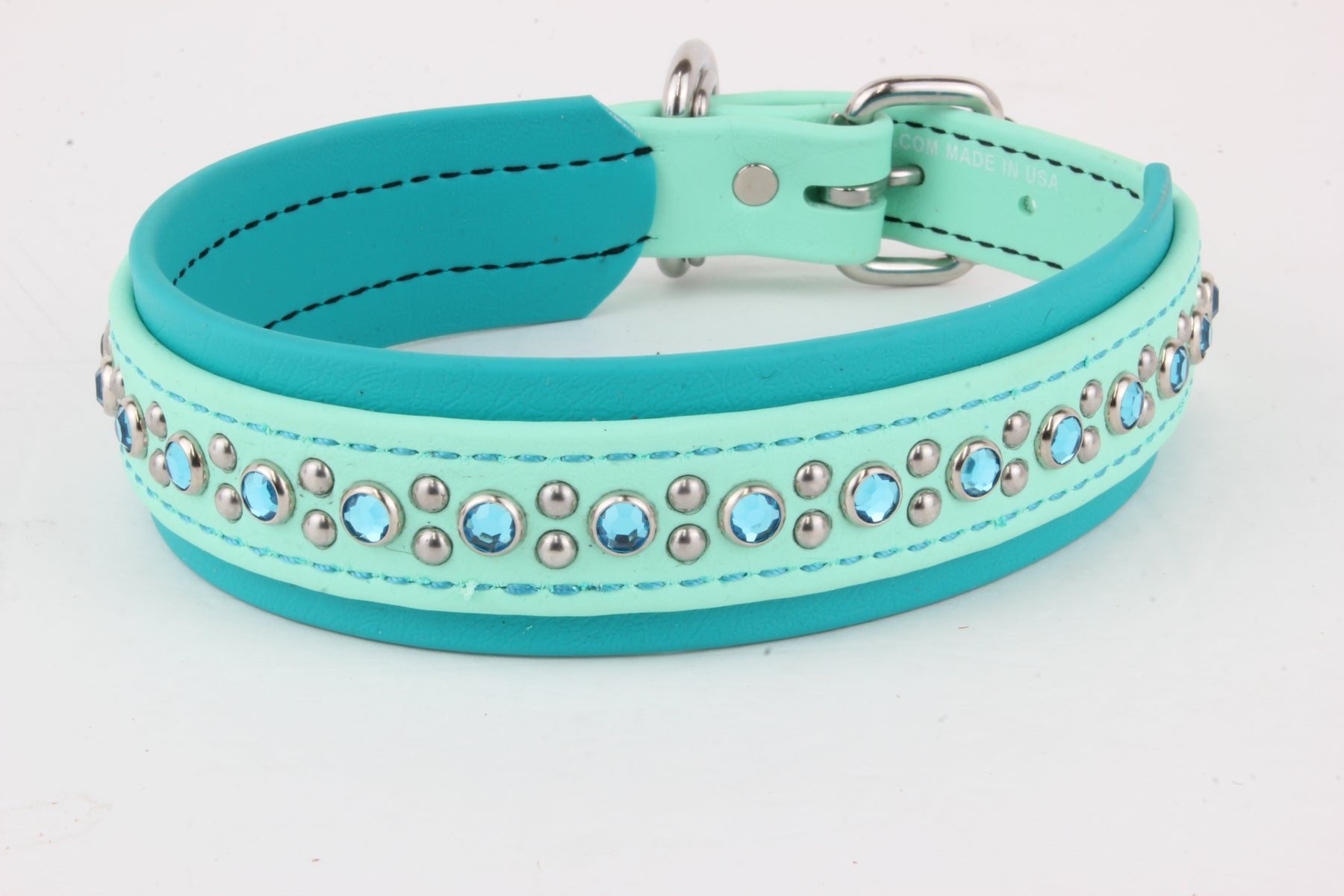 Our BioThane Bling Collars are made from the same original BioThane as our other products, with a little sparkle!  They are easy to clean, durable and waterproof.  We use BioThane Beta 520 Super Heavy material.