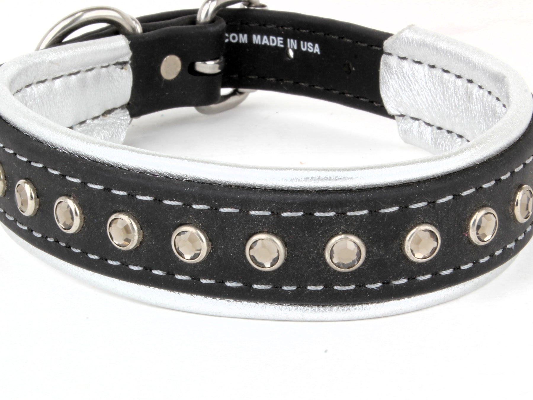 Our BioThane w/Leather Bling Collars are made from the same original BioThane as our other products, with a little sparkle! They are easy to clean, durable and waterproof. We use BioThane Beta 520 Super Heavy material with a soft leather backing.