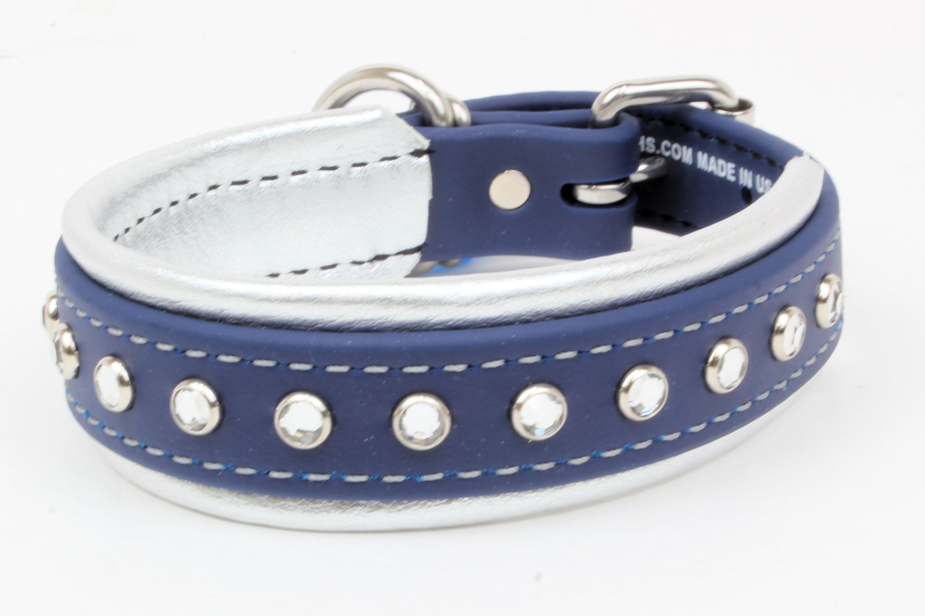 Our BioThane w/Leather Bling Collars are made from the same original BioThane as our other products, with a little sparkle!  They are easy to clean, durable and waterproof.  We use BioThane Beta 520 Super Heavy material with a soft leather backing.