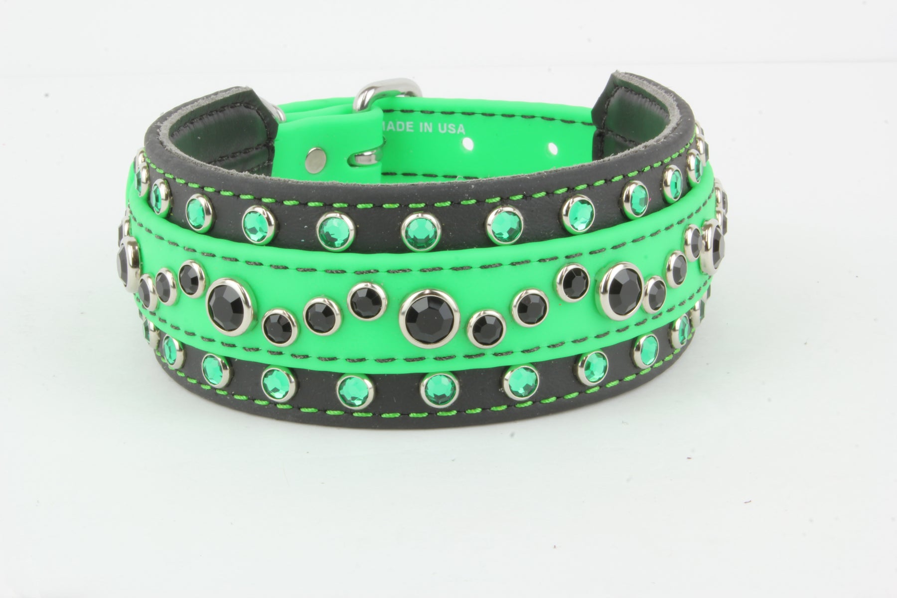 Our BioThane MegaBling Collars are made from the same original BioThane as our other products, with sparkle! They are easy to clean, durable and waterproof. We use BioThane Beta 520 Super Heavy material. Because of the additional biothane and Bling, BioThane MegaBling Collars are a heavier collar and not for a small dog. 2" x 22" (fits 20"-24")
