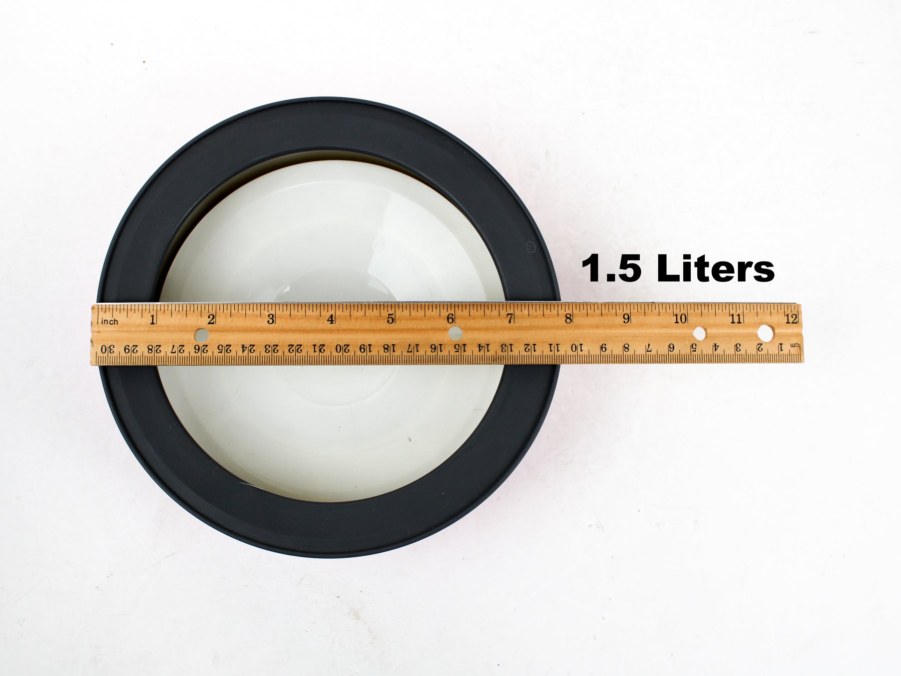 These bowls are 7.75 inches across, 3 inches tall, and hold 1.5 liters of water.
