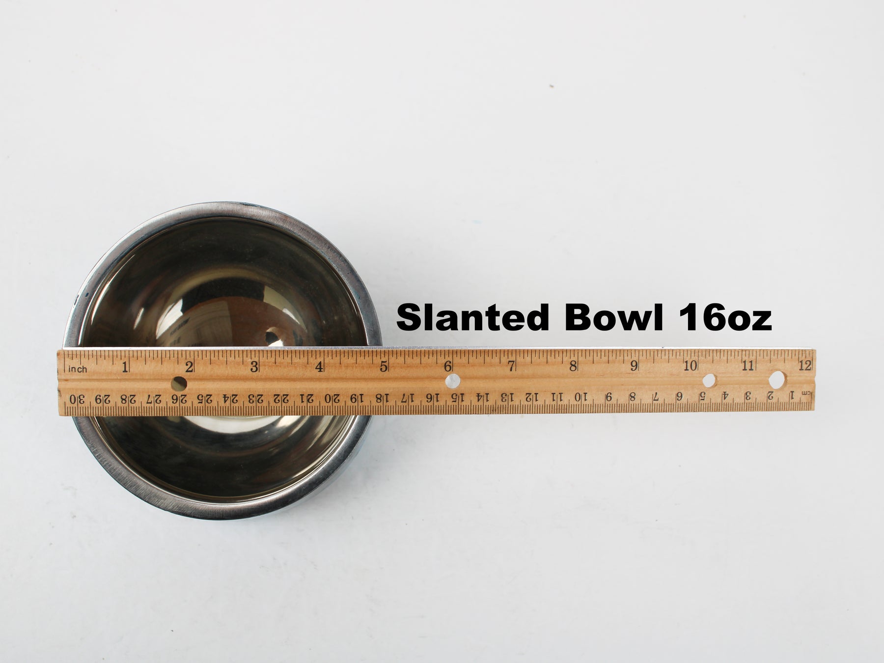 These bowls are 5 inches across, and hold 16 ounces of water.