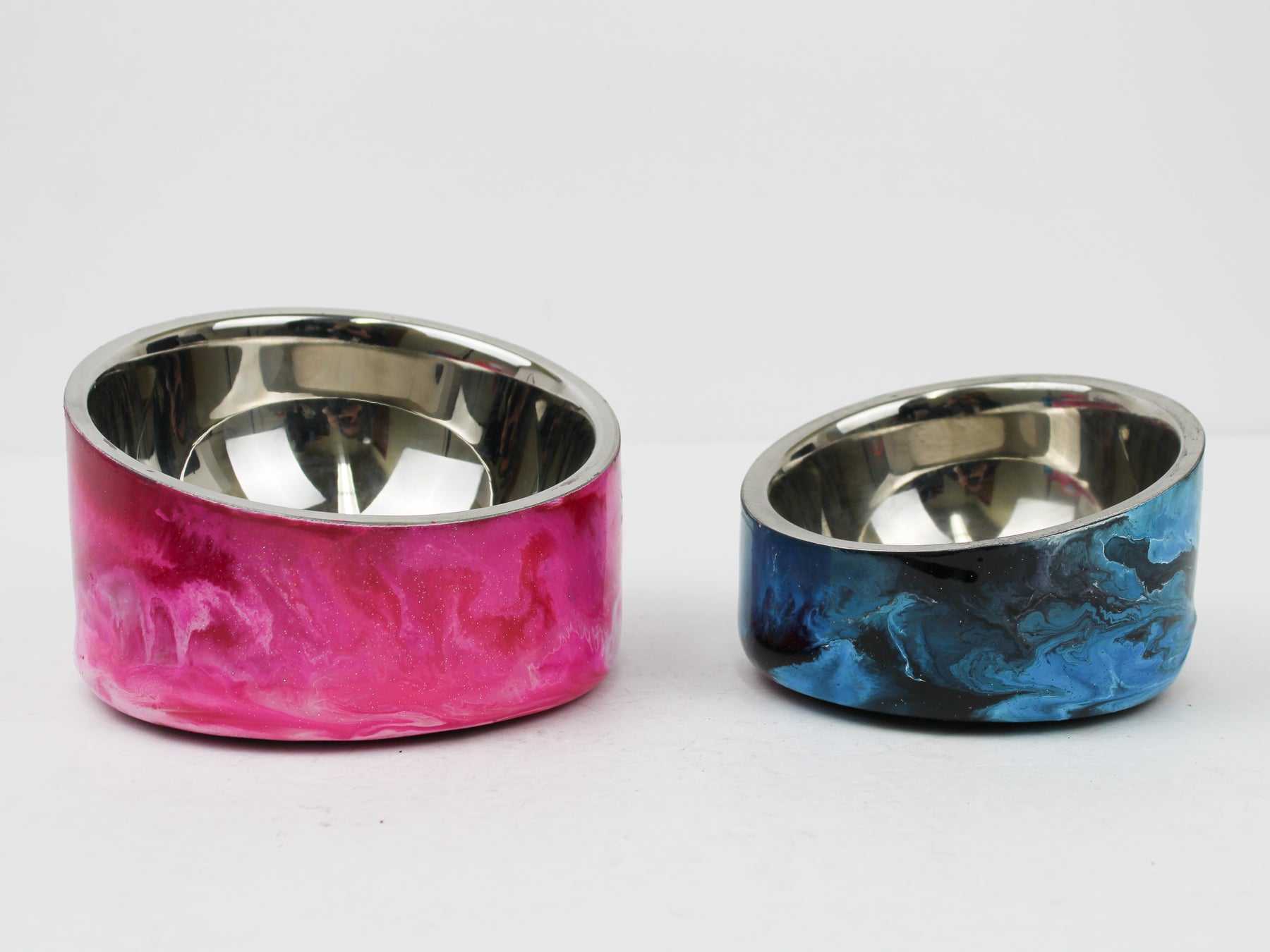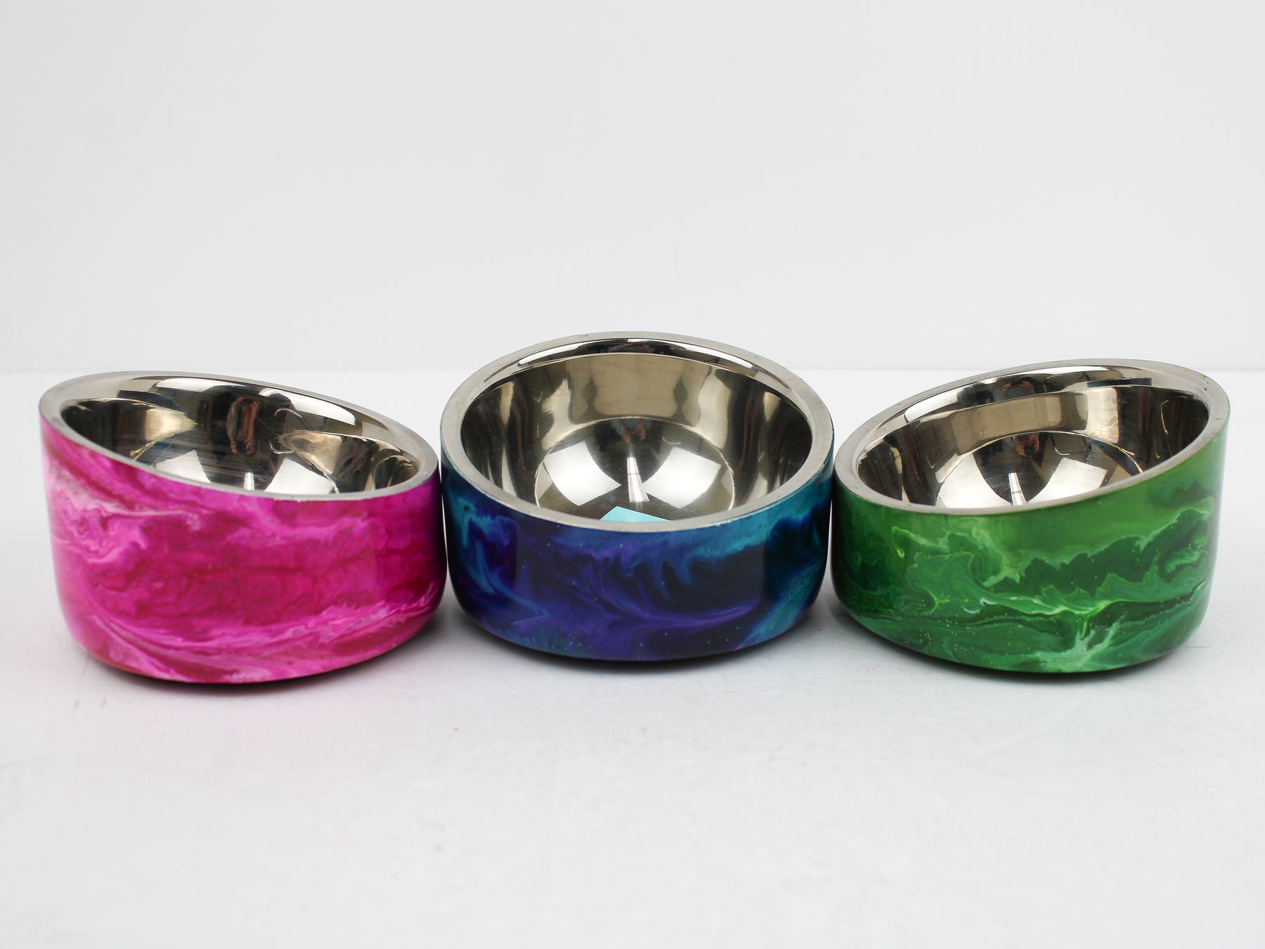 Designer Food Bowls are handmade and truly one of a kind design, crafted with a durable epoxy finish on a stainless-steel bowl that’s built to last. Created in Wisconsin by a retired veterinary technician, every item reflects skill, attention to detail, and a commitment to quality. To preserve its shine and longevity, each piece should be hand washed only.