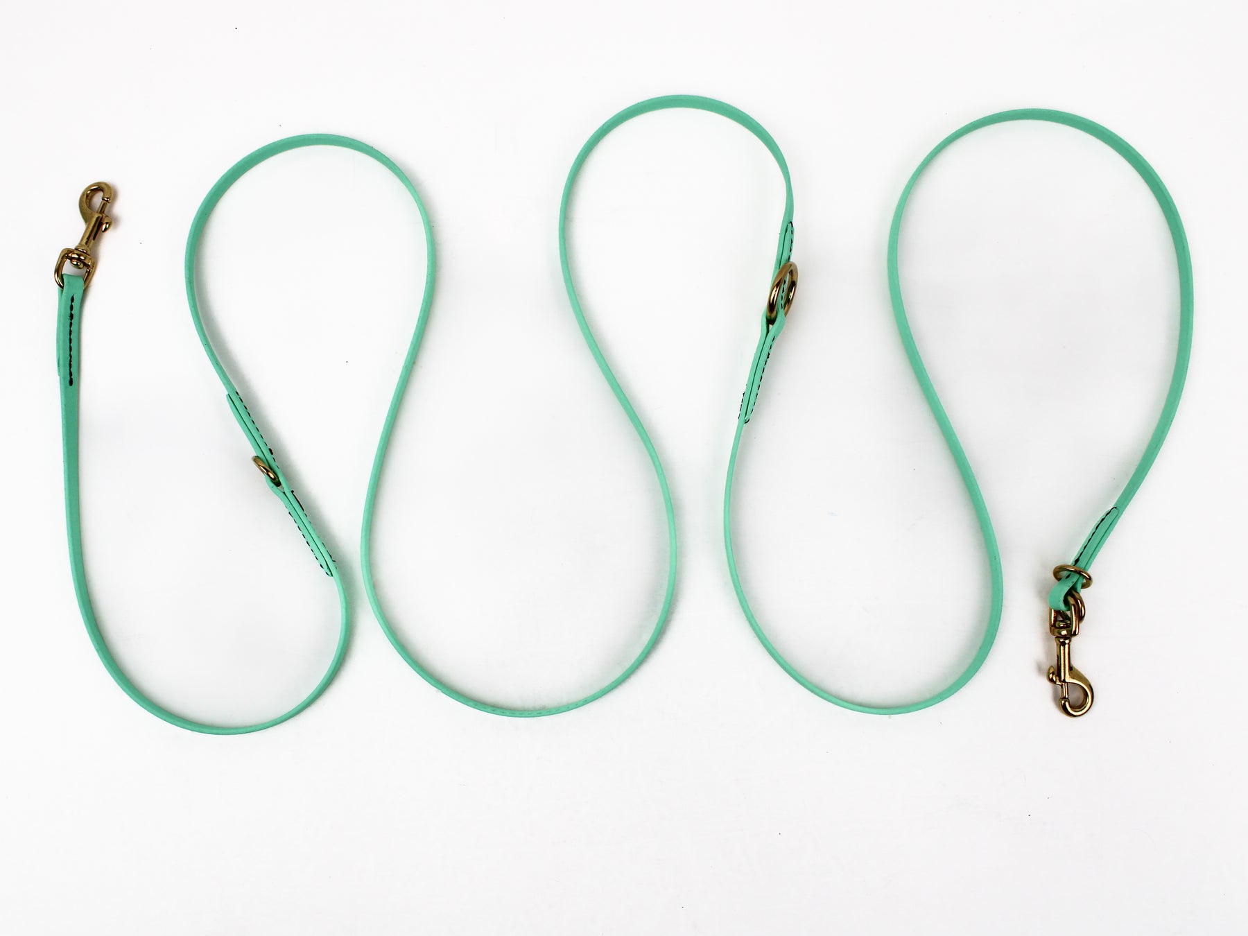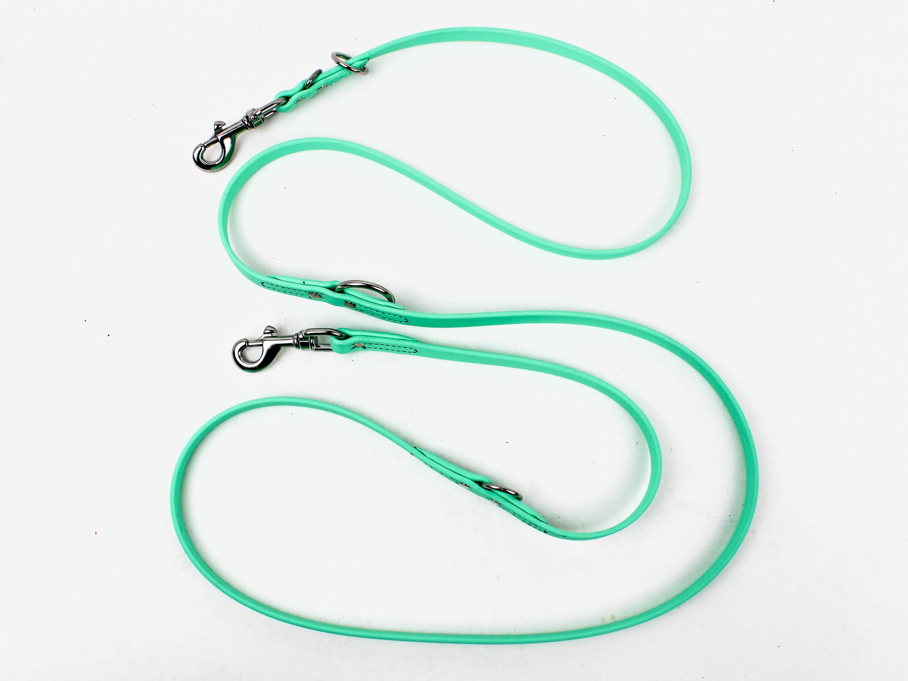 Our BioThane Multi-Purpose leashes will quickly become your go-to leash.  They are also known as Jaeger, Hunter, European or adjustable leashes.  Made from US made BioThane and is waterproof, durable, easy to clean and sanitize. Even our narrowest width has a strength limit of 750 pounds. These leashes can be used as hands free, slip leash, tie out, two dog walker, 7' leash, 5' leash, and a 3' leash. We use commercial grade stitching with rivets for longevity. BioThane Multi-Purpose Leashes are available in three sizes and 30 colors.