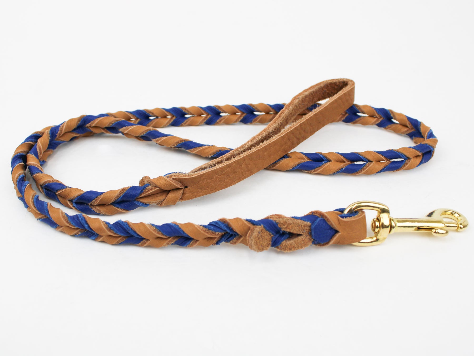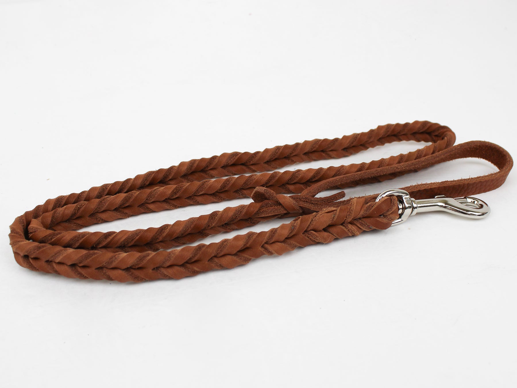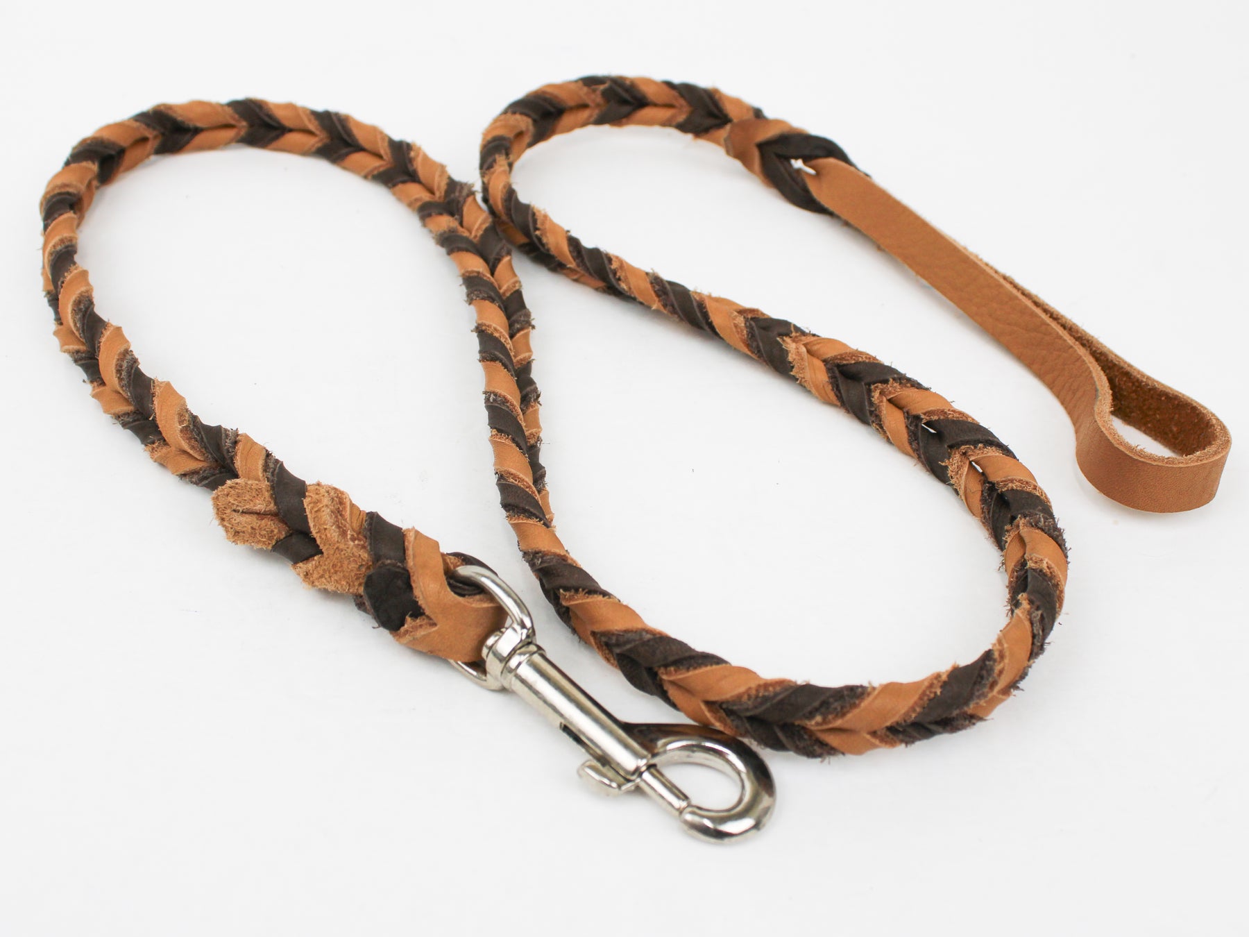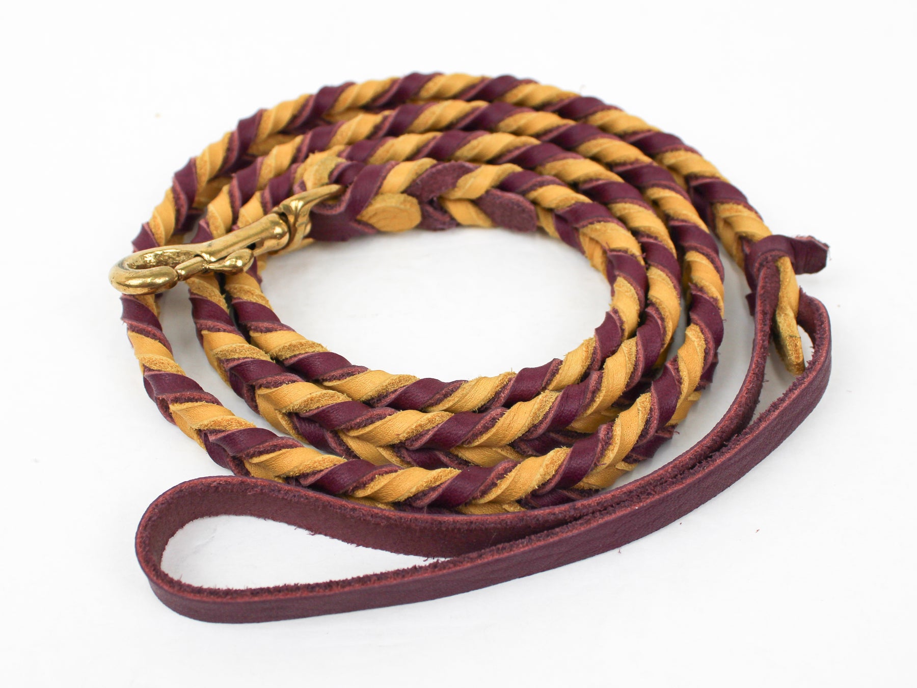 The Braided leather leash is handmade in our shop in Minnesota and custom made for each order! Soft leather is a buttery soft bullhide, while the latigo leather is a stiffer leather that will soften with use. With so many options, you can create the perfect leash for your best friend. Keep in mind that because these are handmade, there may be a slight variation on the length. Leather does stretch and relax with use. The "primary" color will be the color of the handle. Standard snap color is silver (except w/gold leather). We reserve the right to reverse your primary and secondary options to increase the durability of the leash. 1/4" are in a separate listing. braid12
