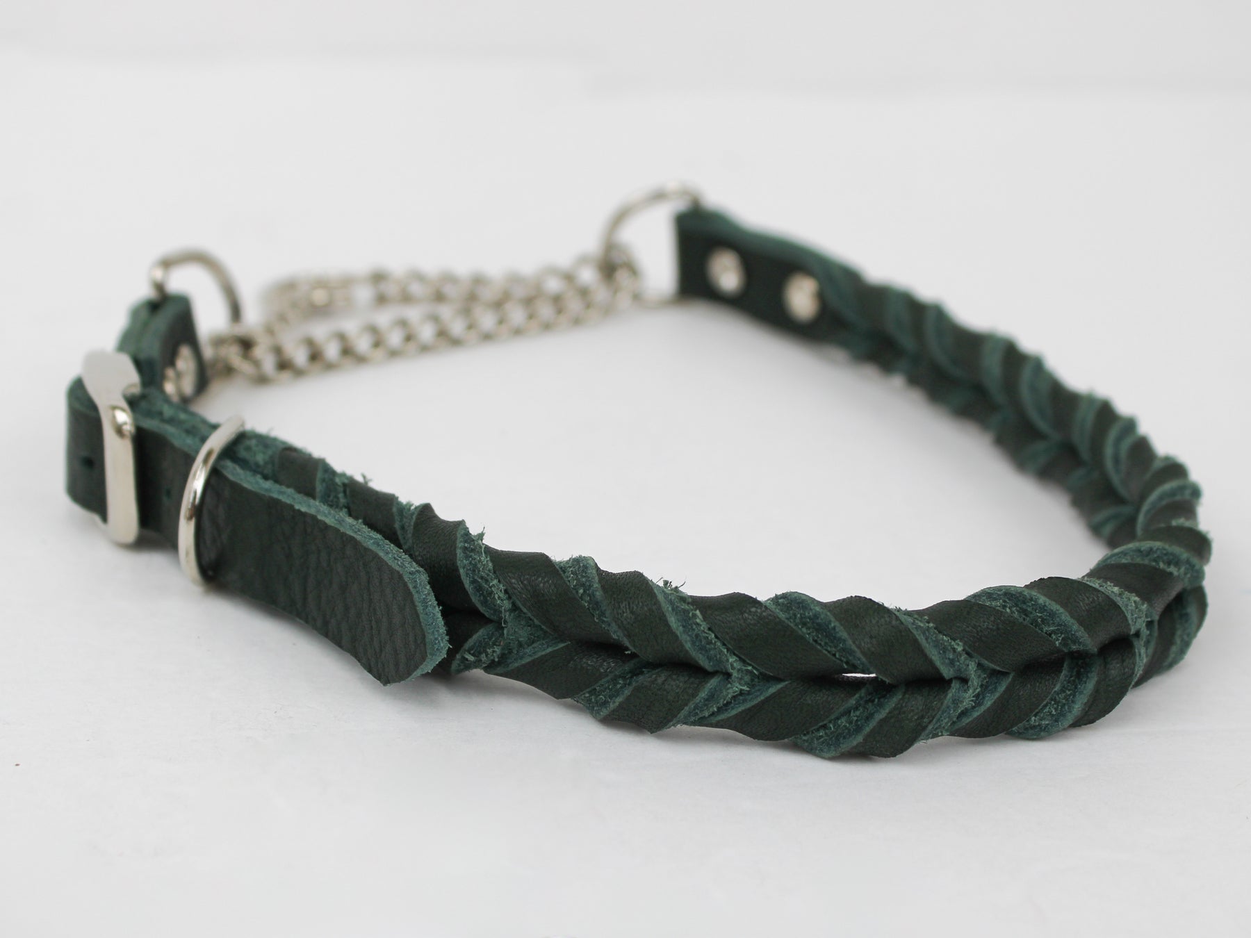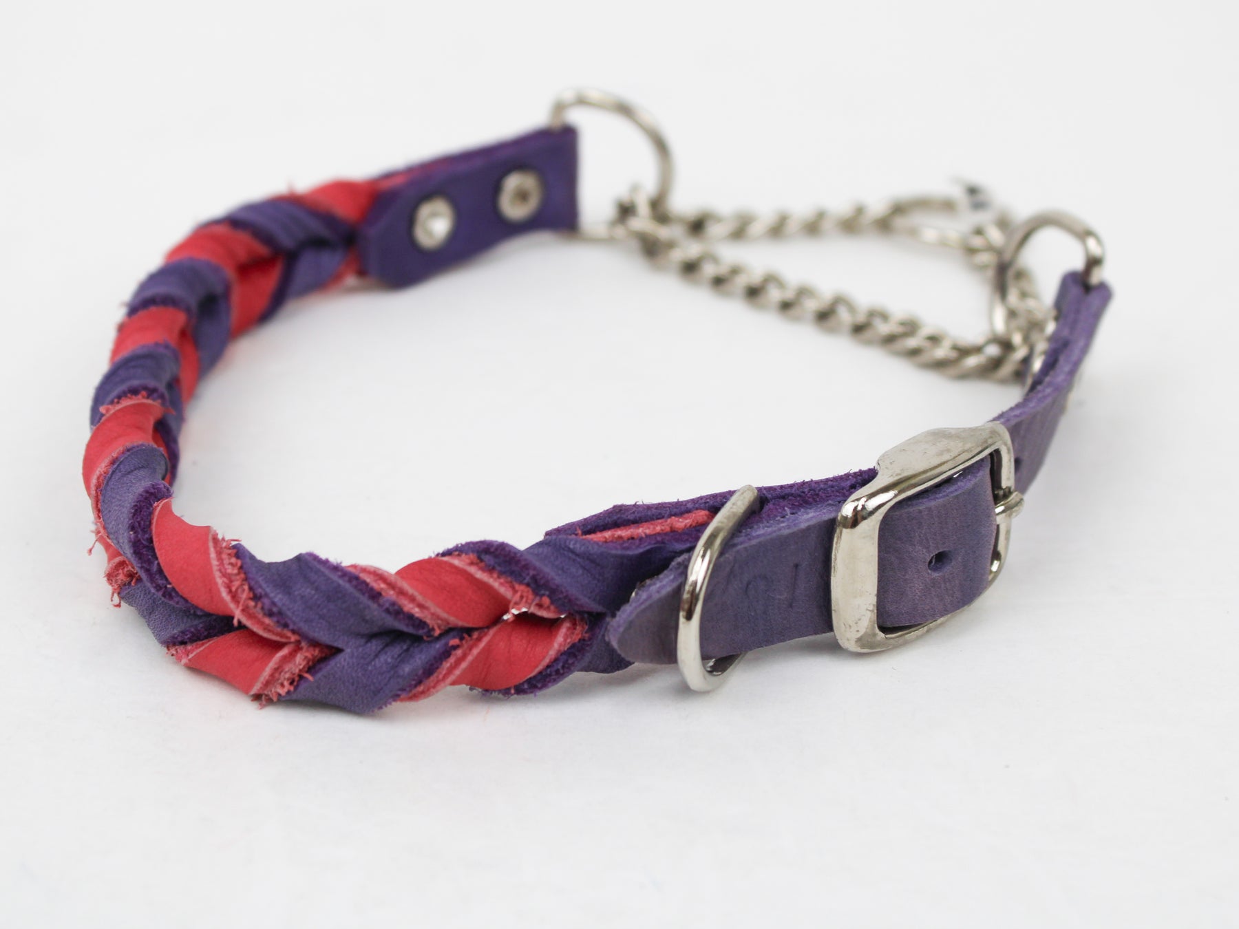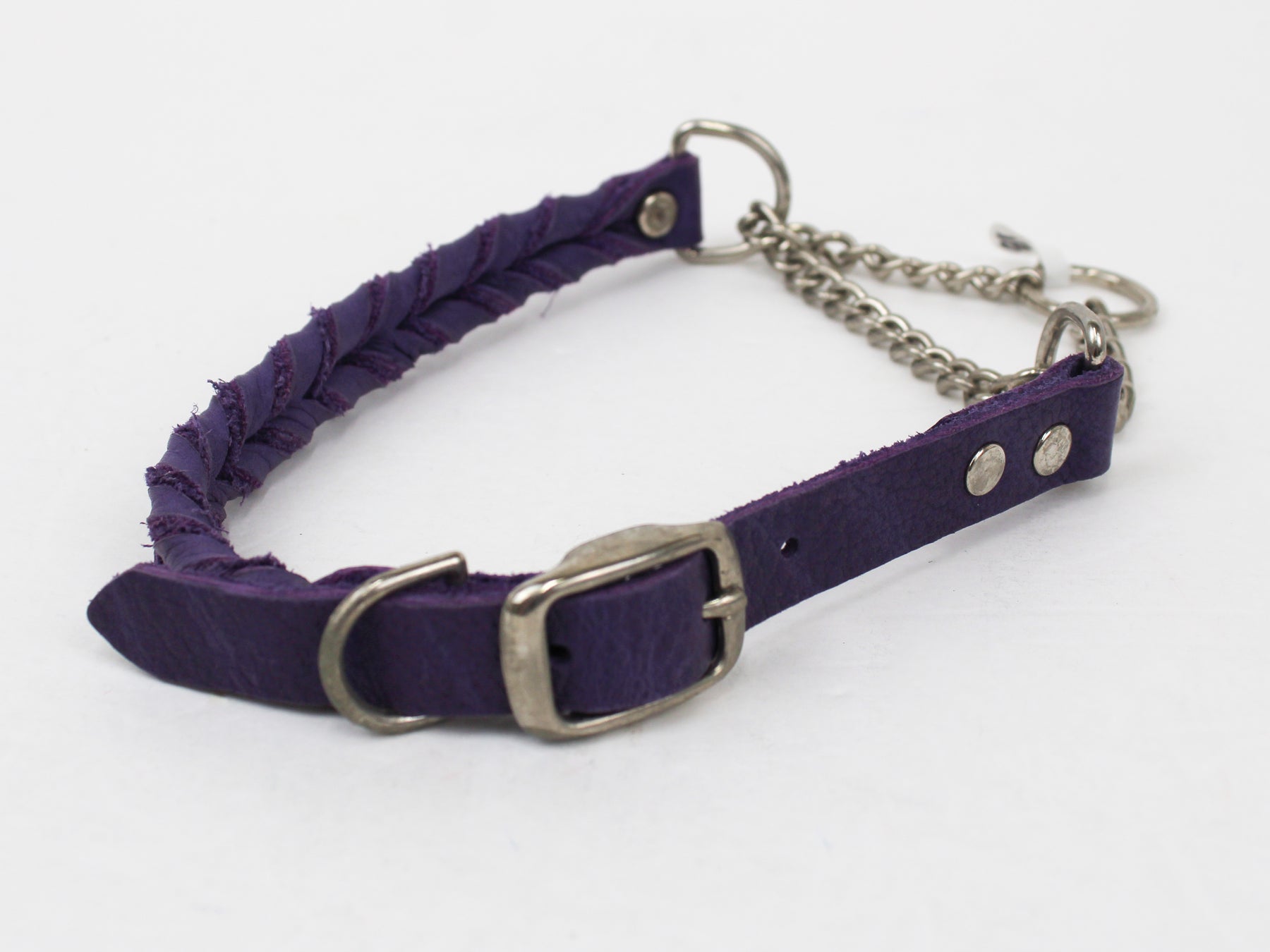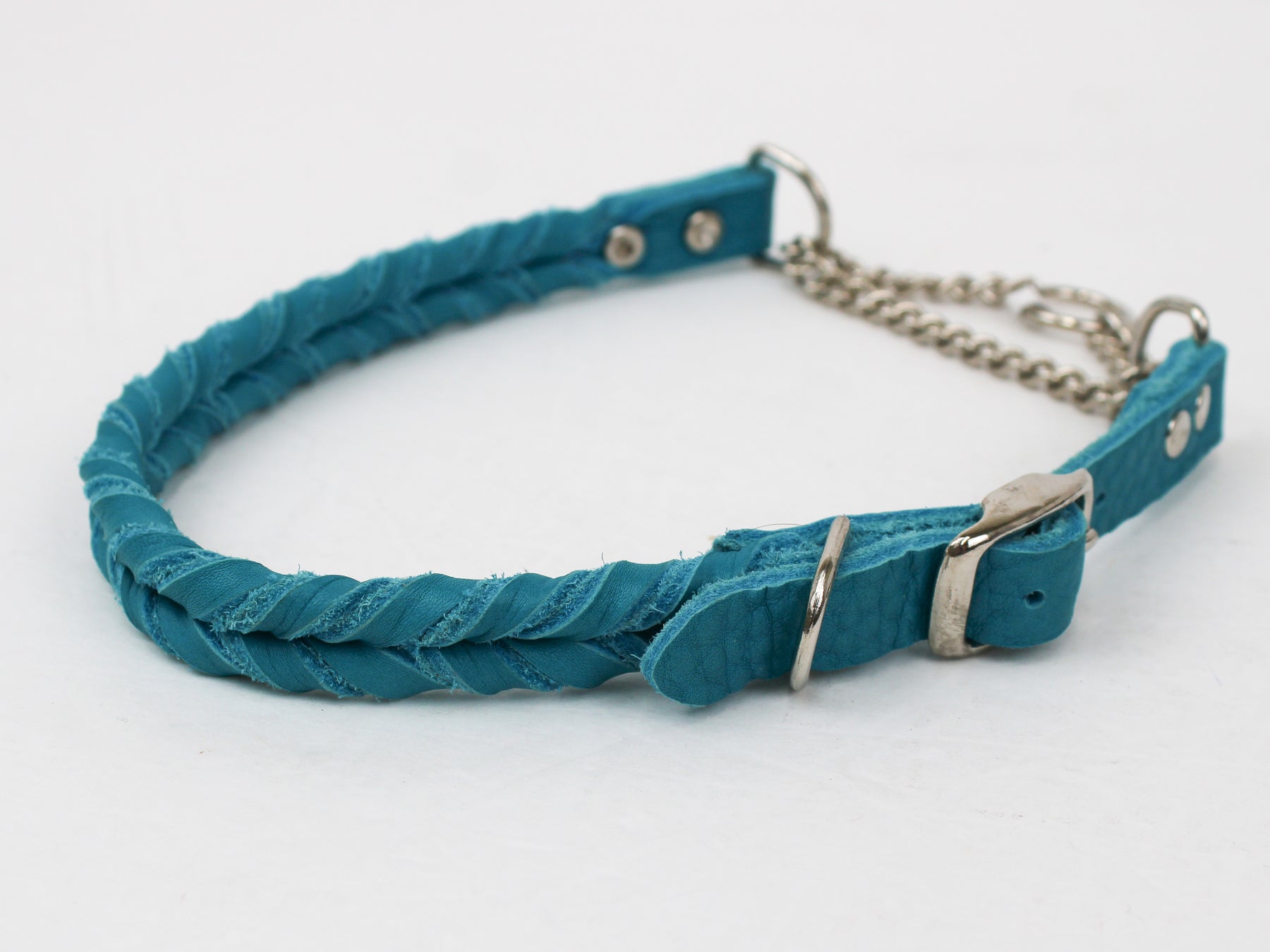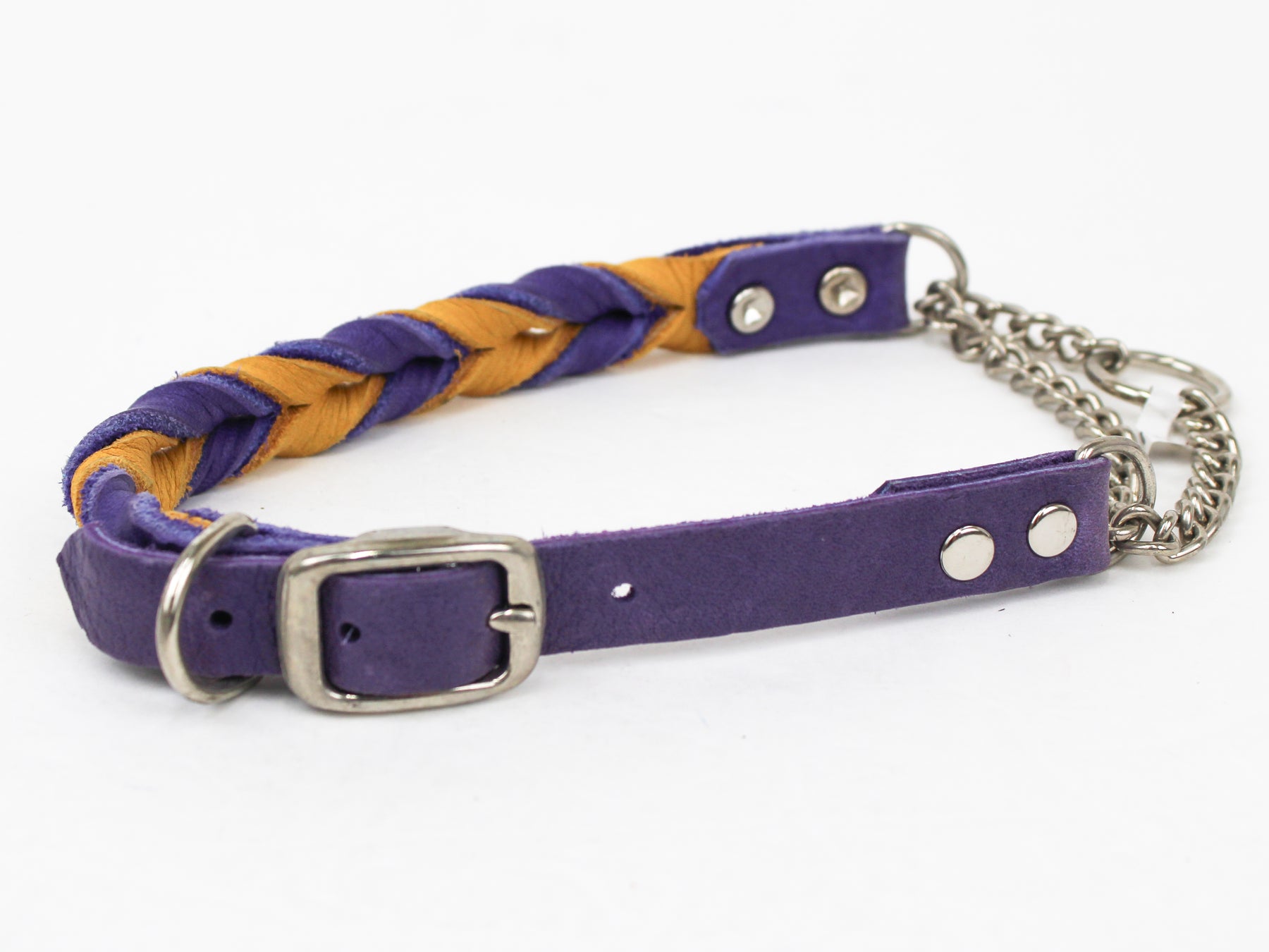 Super Soft Braided Leather Adjustable Martingale Collars have comfortable flexibility with ultimate control and no fear of the dog slipping out of the collar. This leather is easy on the dog's coat. These martingales feature a buckle for easy on and off as well as a little extra size adjustment.   Non-adjustable are available as well!  We also have matching leather leashes. If you see a combination, either color or size, that we don't have listed, please reach out!   For more info visit our sizing page!  All leather is handmade in our shop in Minnesota.  The "primary" color will be the color that attaches to the chain.  We reserve the right to reverse your primary and secondary options to increase the durability of the leash.