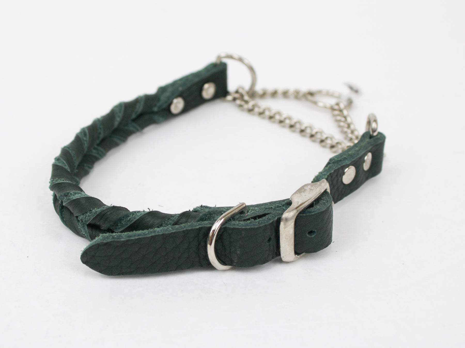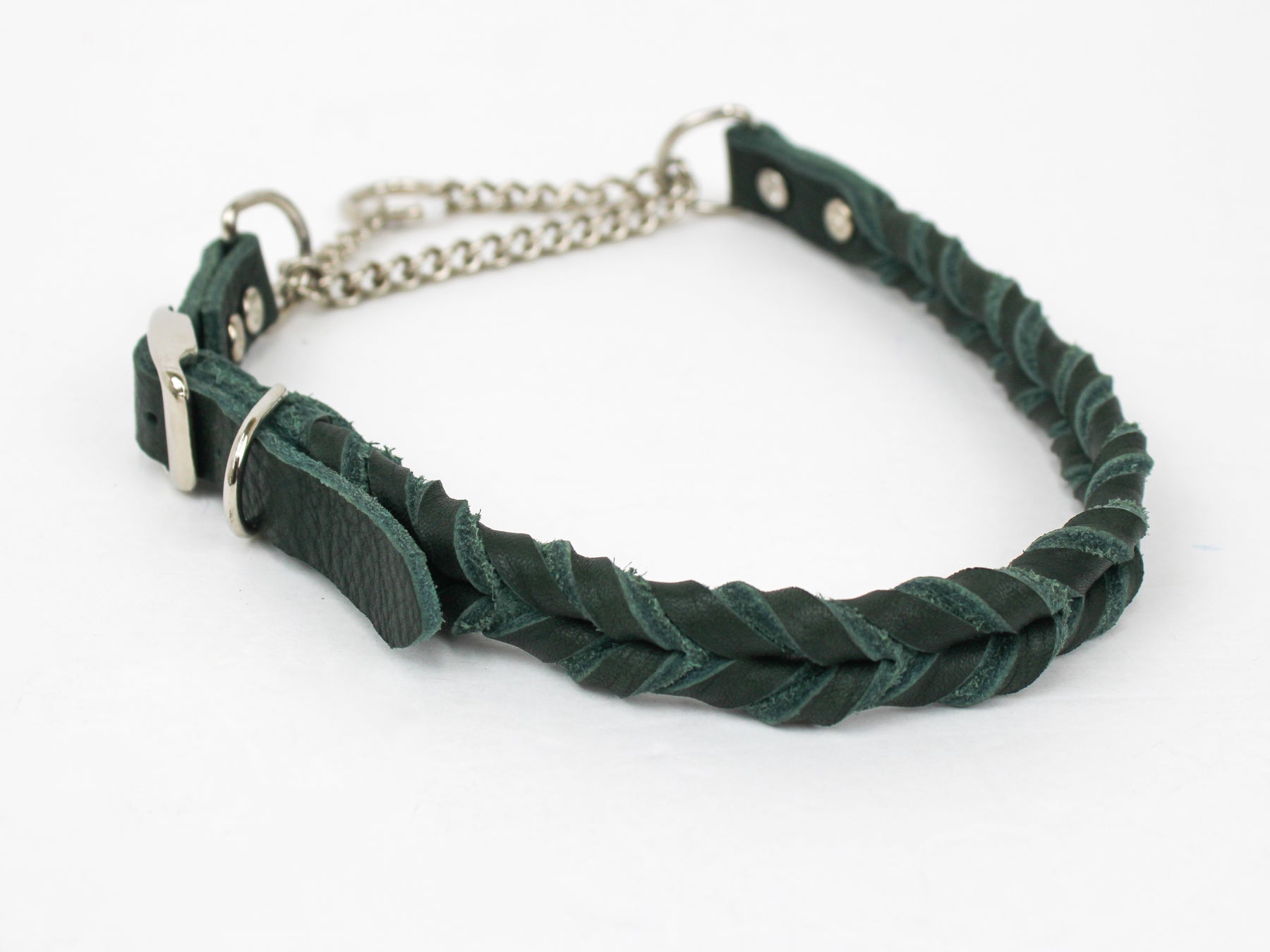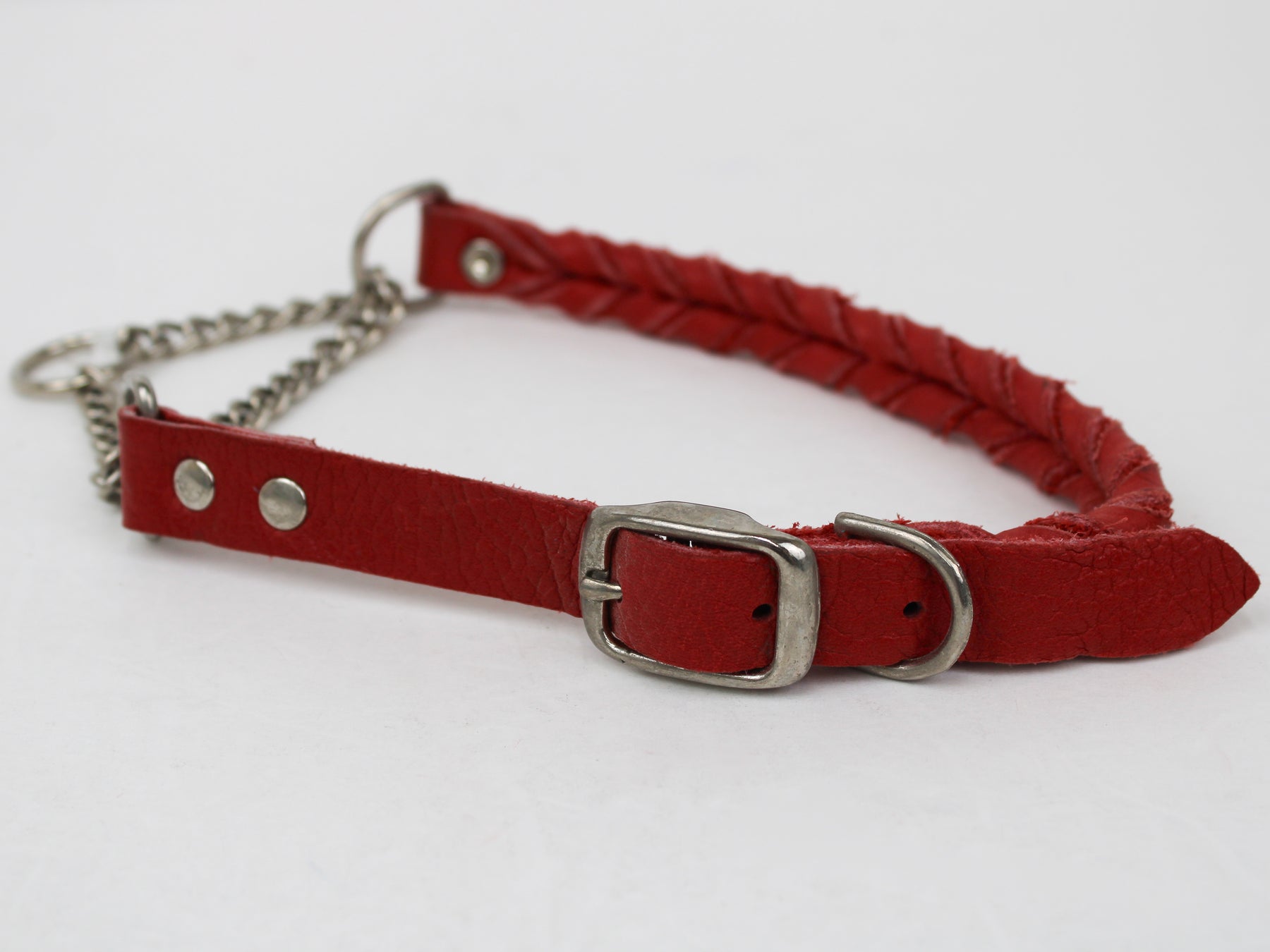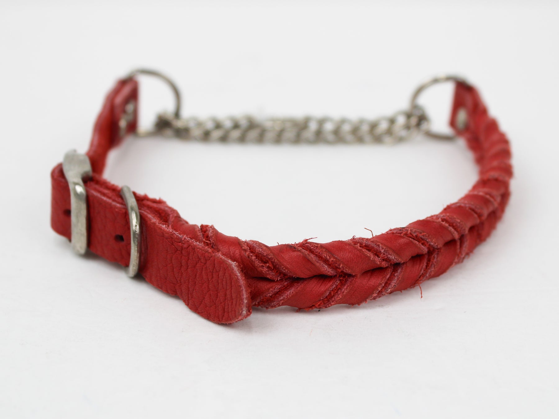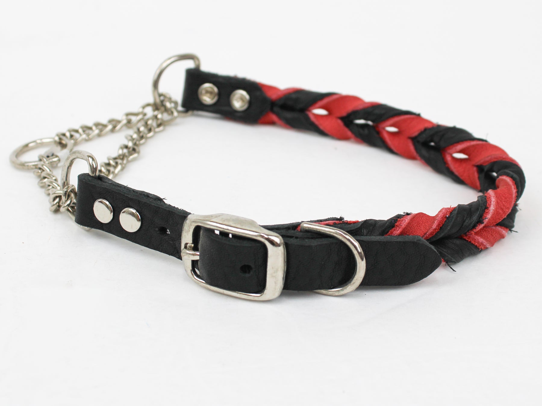 Super Soft Braided Leather Adjustable Martingale Collars have comfortable flexibility with ultimate control and no fear of the dog slipping out of the collar. This leather is easy on the dog's coat. These martingales feature a buckle for easy on and off as well as a little extra size adjustment.   Non-adjustable are available as well!  We also have matching leather leashes. If you see a combination, either color or size, that we don't have listed, please reach out!   For more info visit our sizing page!  All leather is handmade in our shop in Minnesota.  The "primary" color will be the color that attaches to the chain.  We reserve the right to reverse your primary and secondary options to increase the durability of the leash.