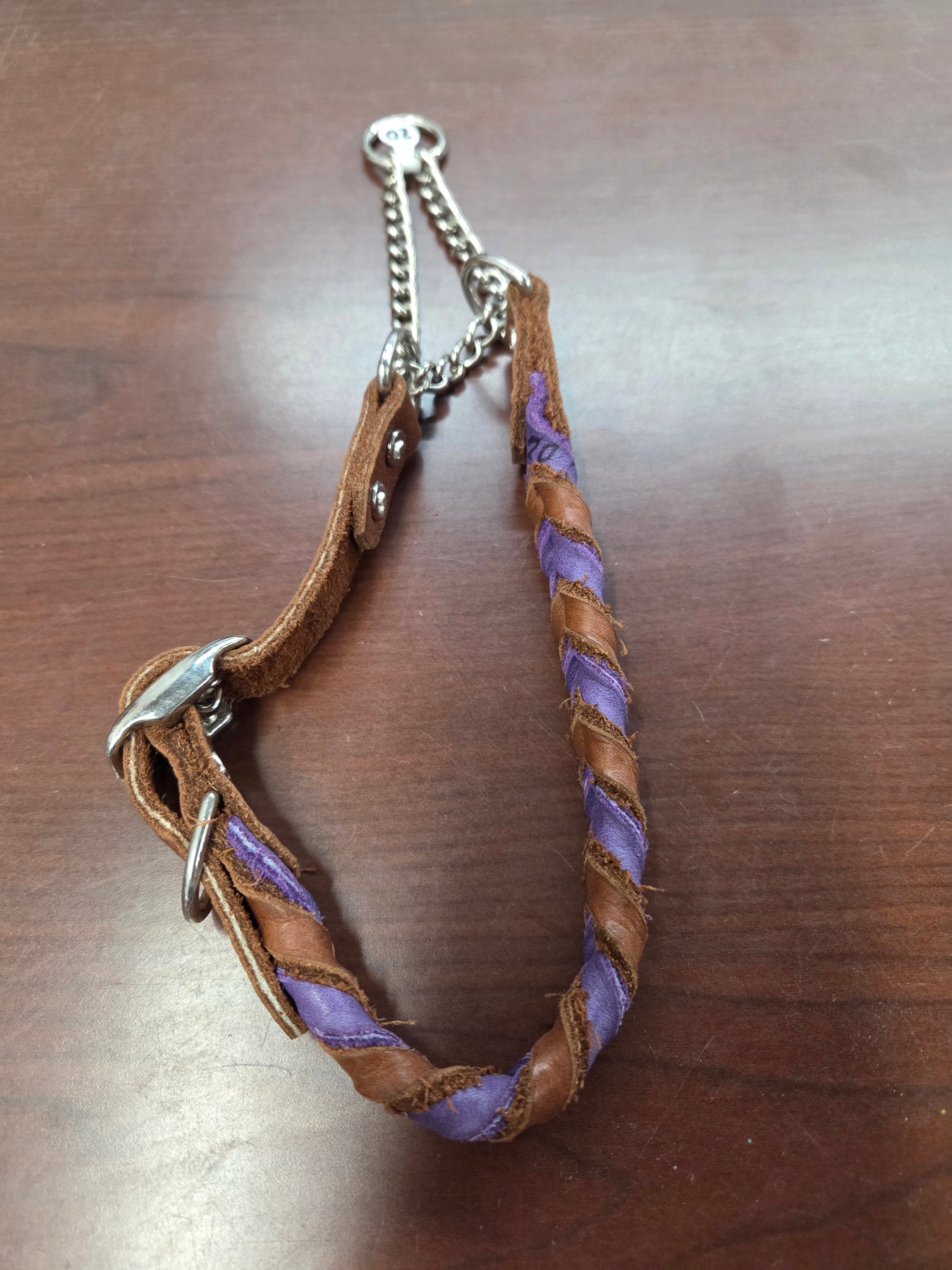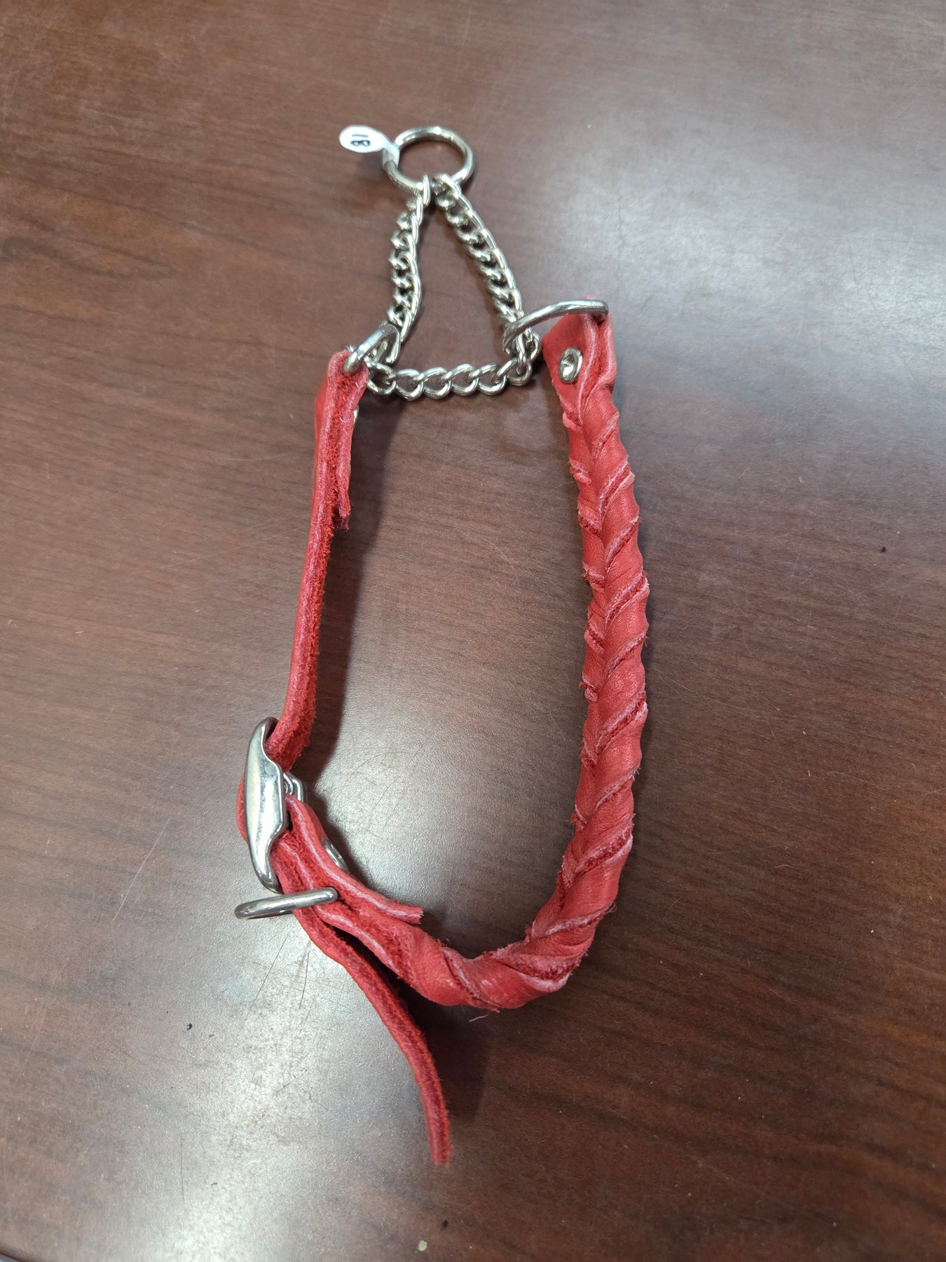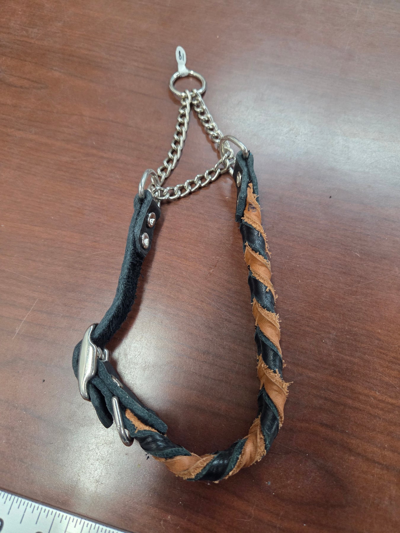 The Braided Leather Adjustable Martingale Collar have a buckle so there is no need to slip over the dog's head, like a traditional martingale collar. Measure the widest part of your dog's neck. Contact us if you have sizing questions. Please measure using line #2 on our guide to assure an accurate fit. Go up to the closest size.