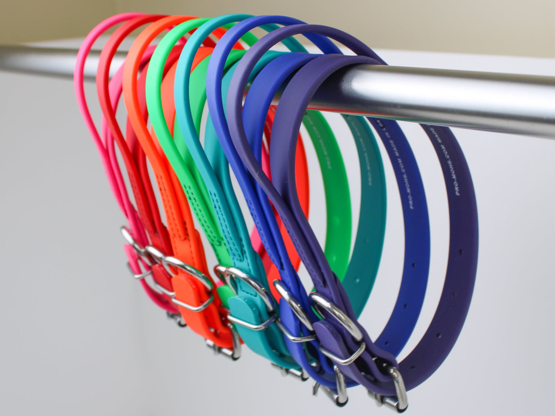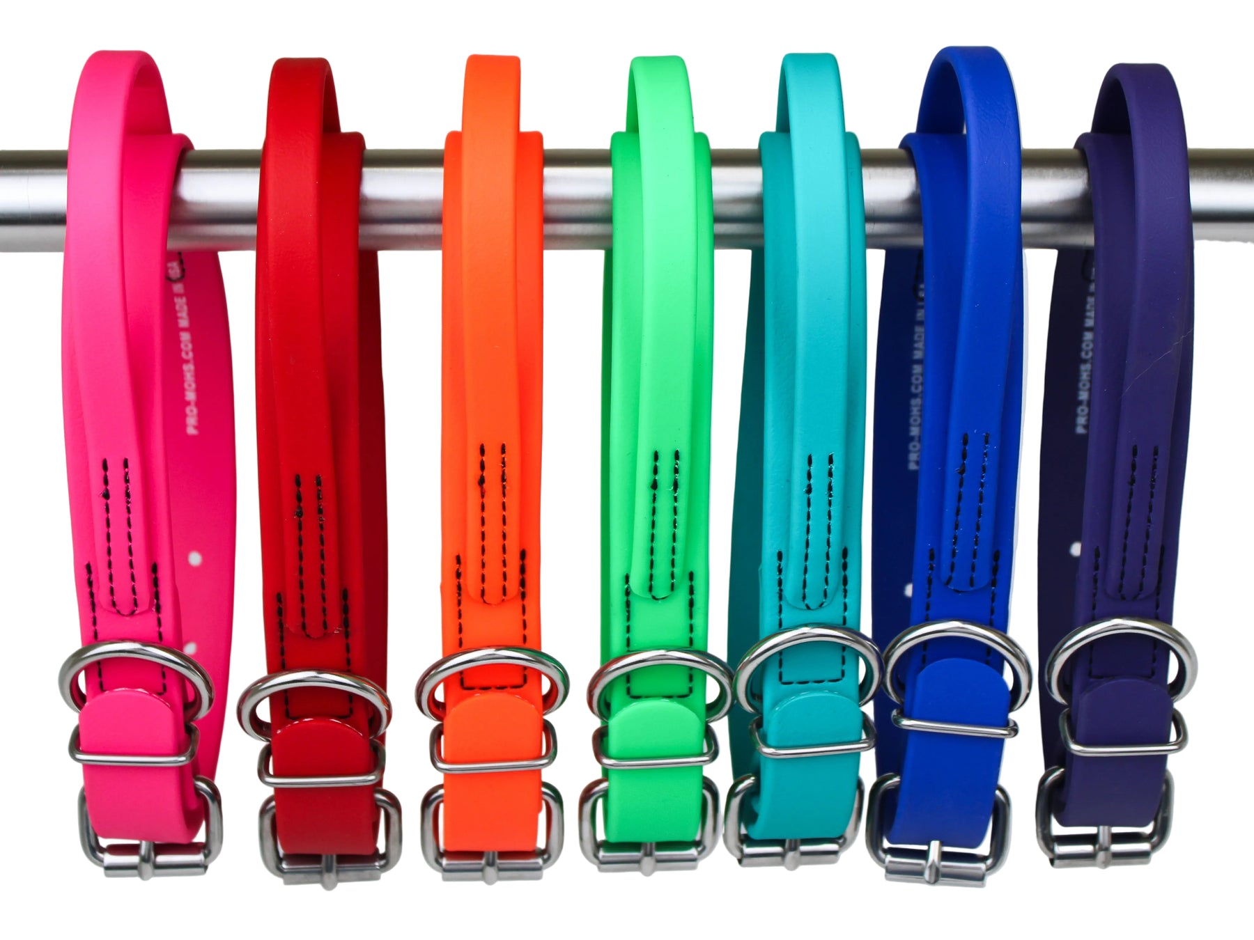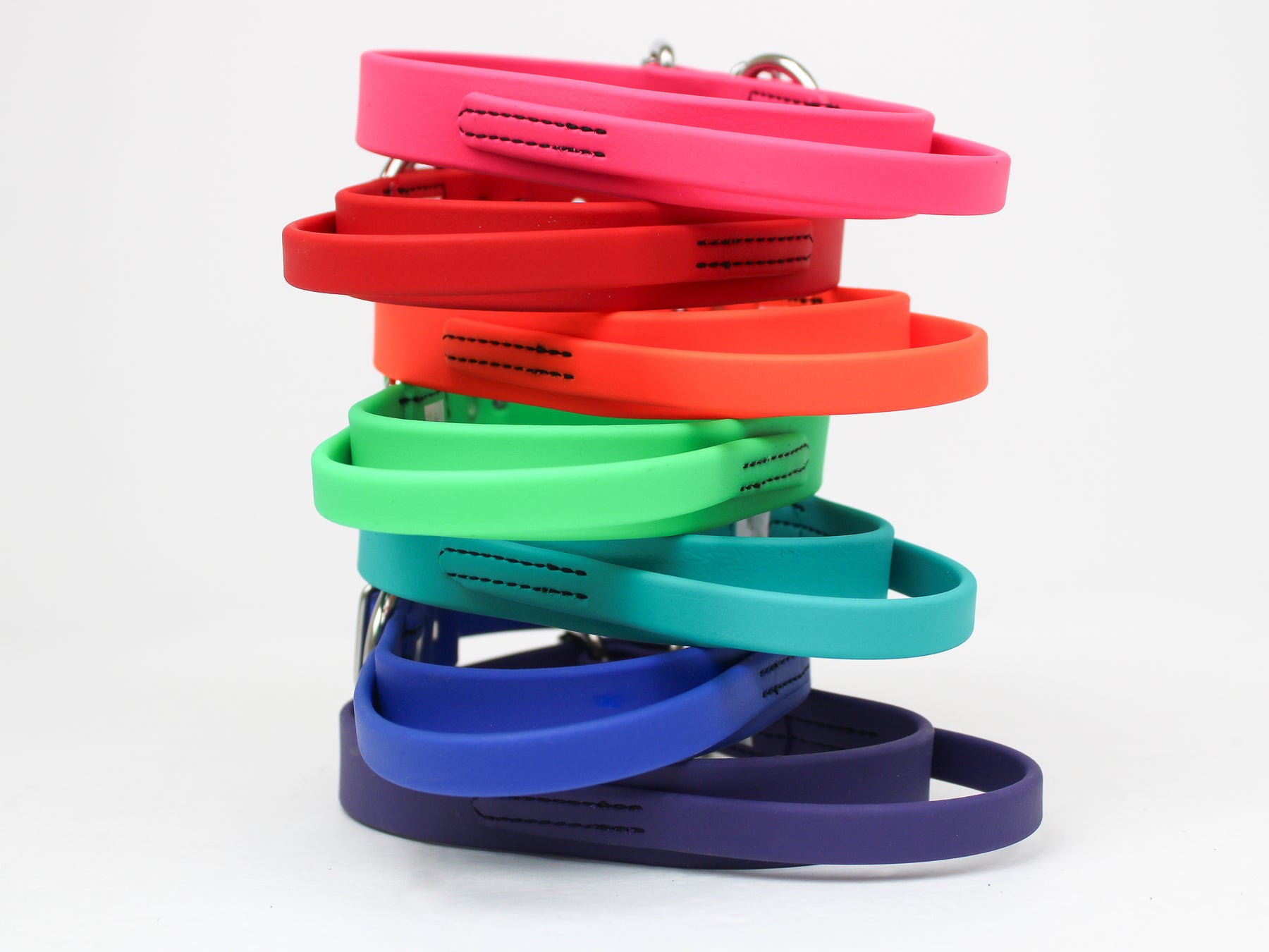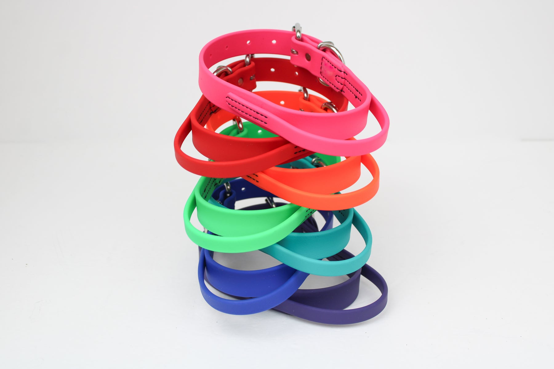 Our BioThane Buckle Collars are waterproof, odor proof, durable and will protect your dog's coat. These collars are handmade in our shop with material made in the USA. BioThane buckle collars are easy to clean and dry quickly