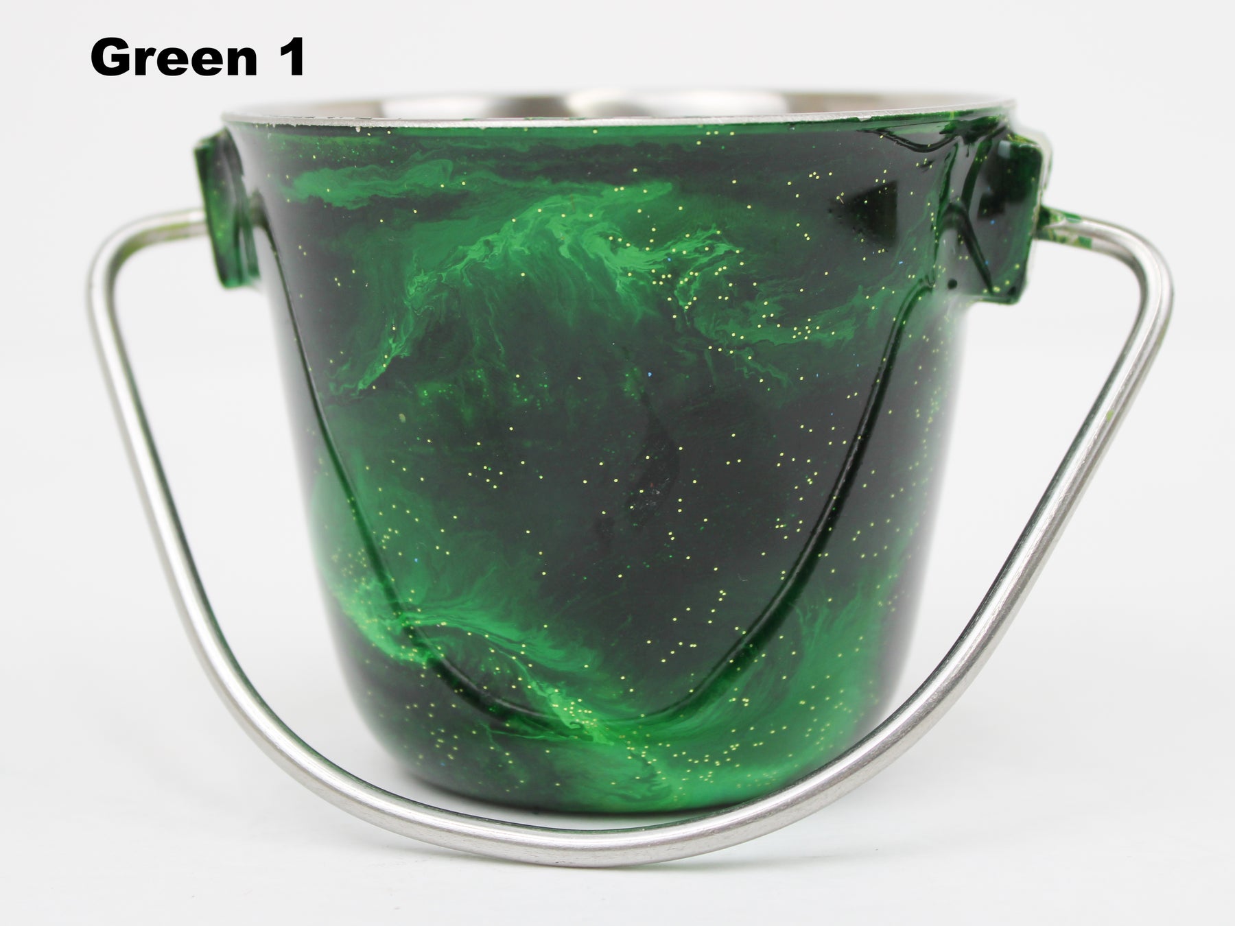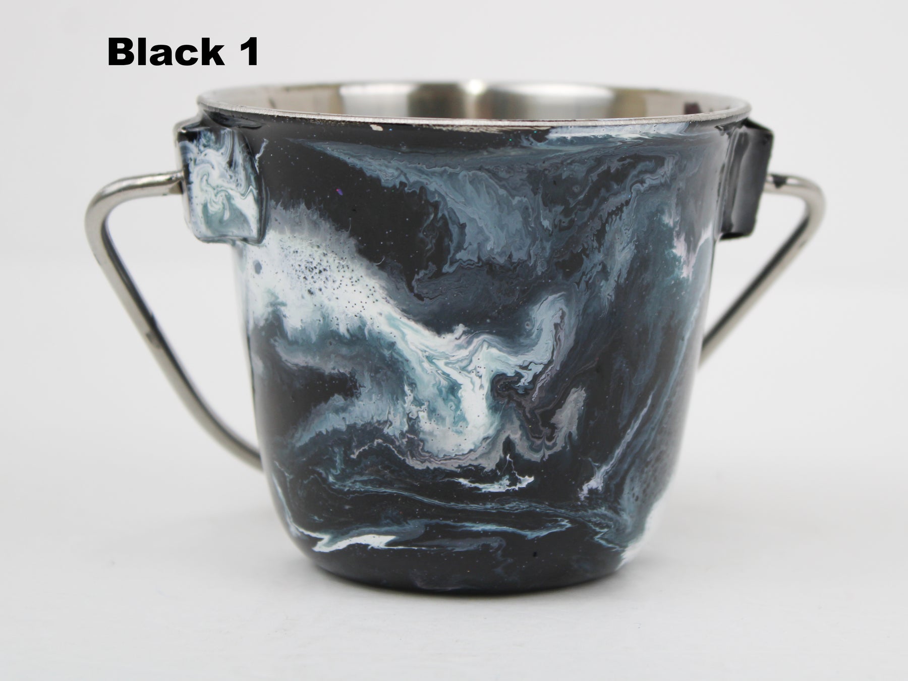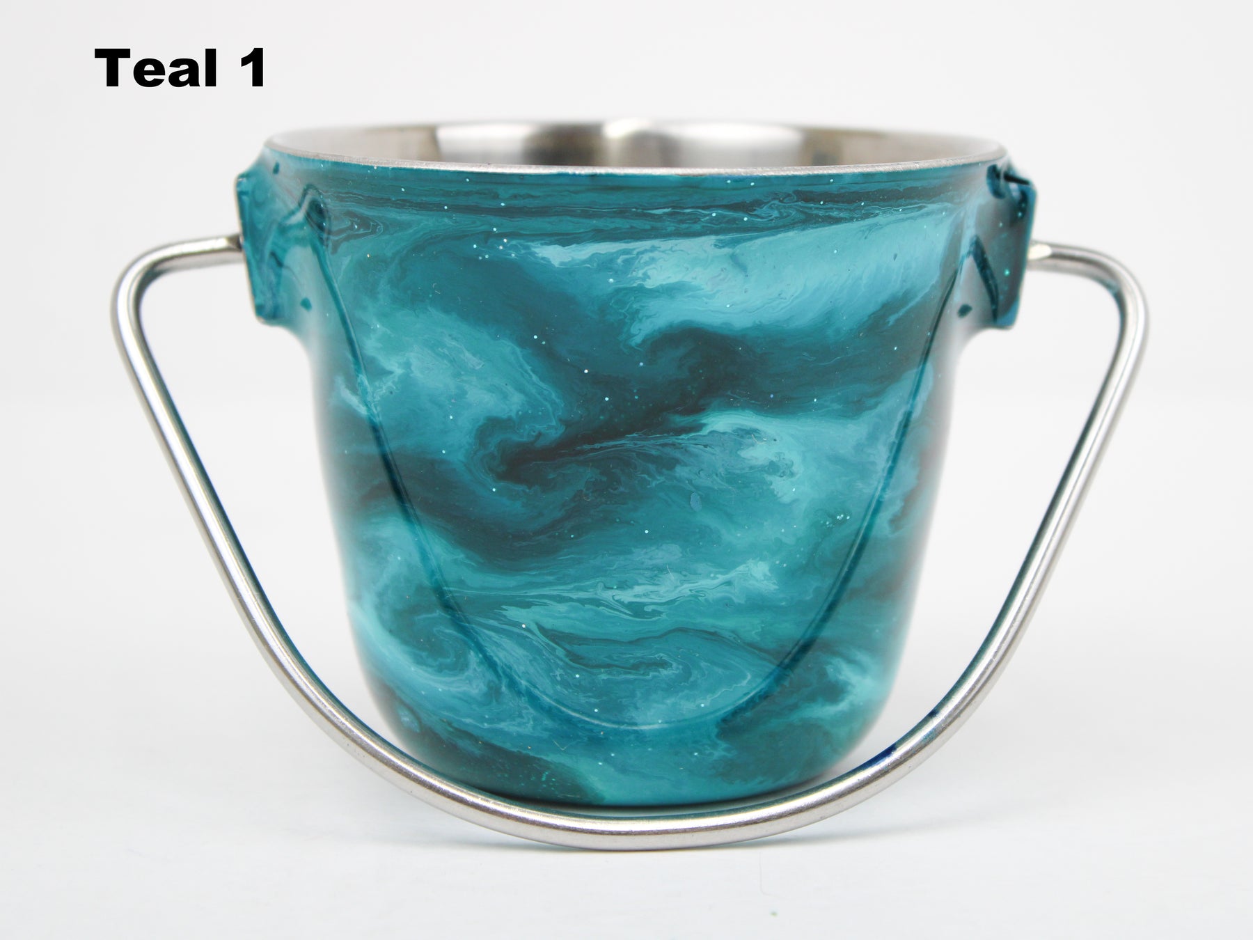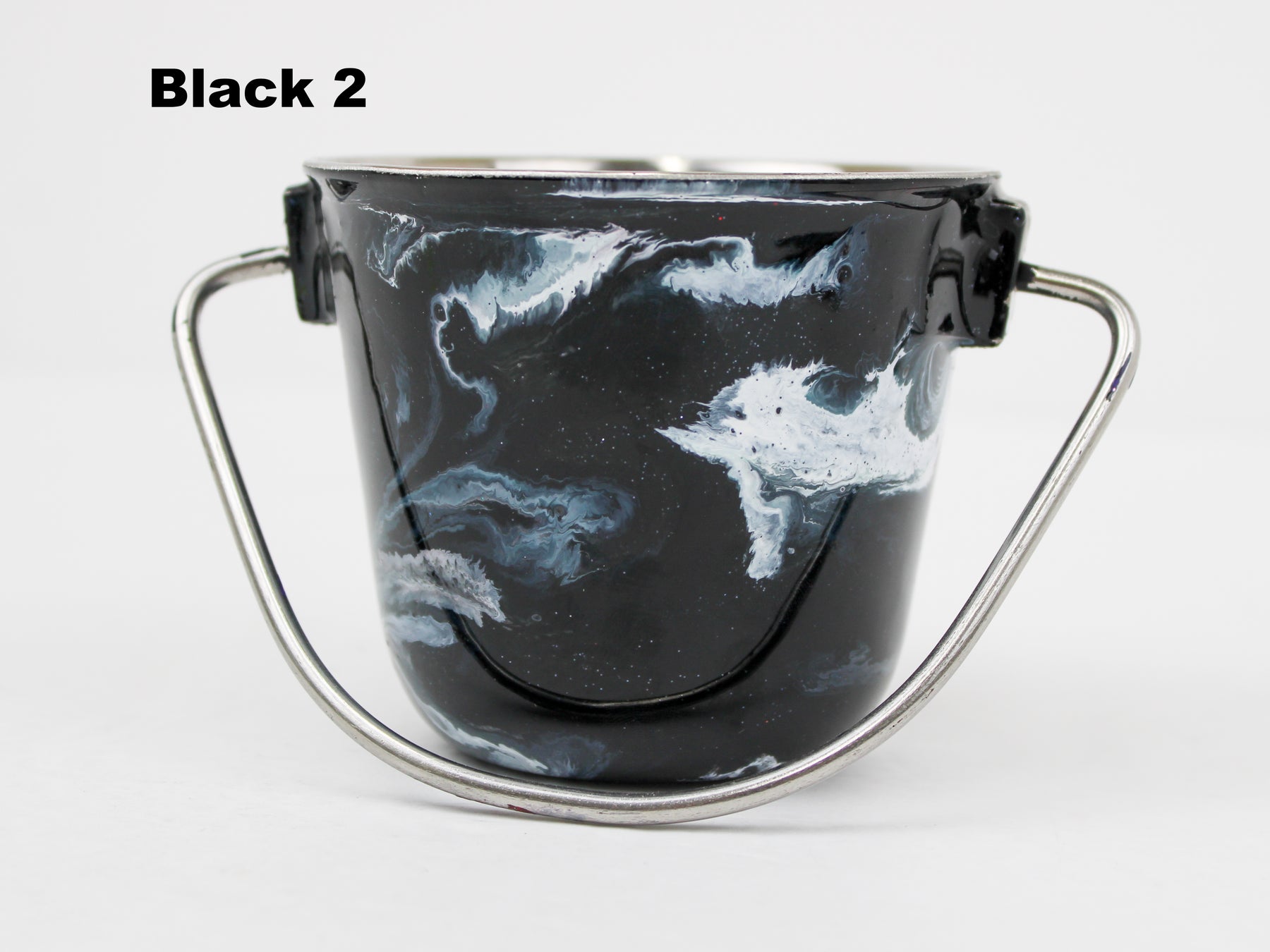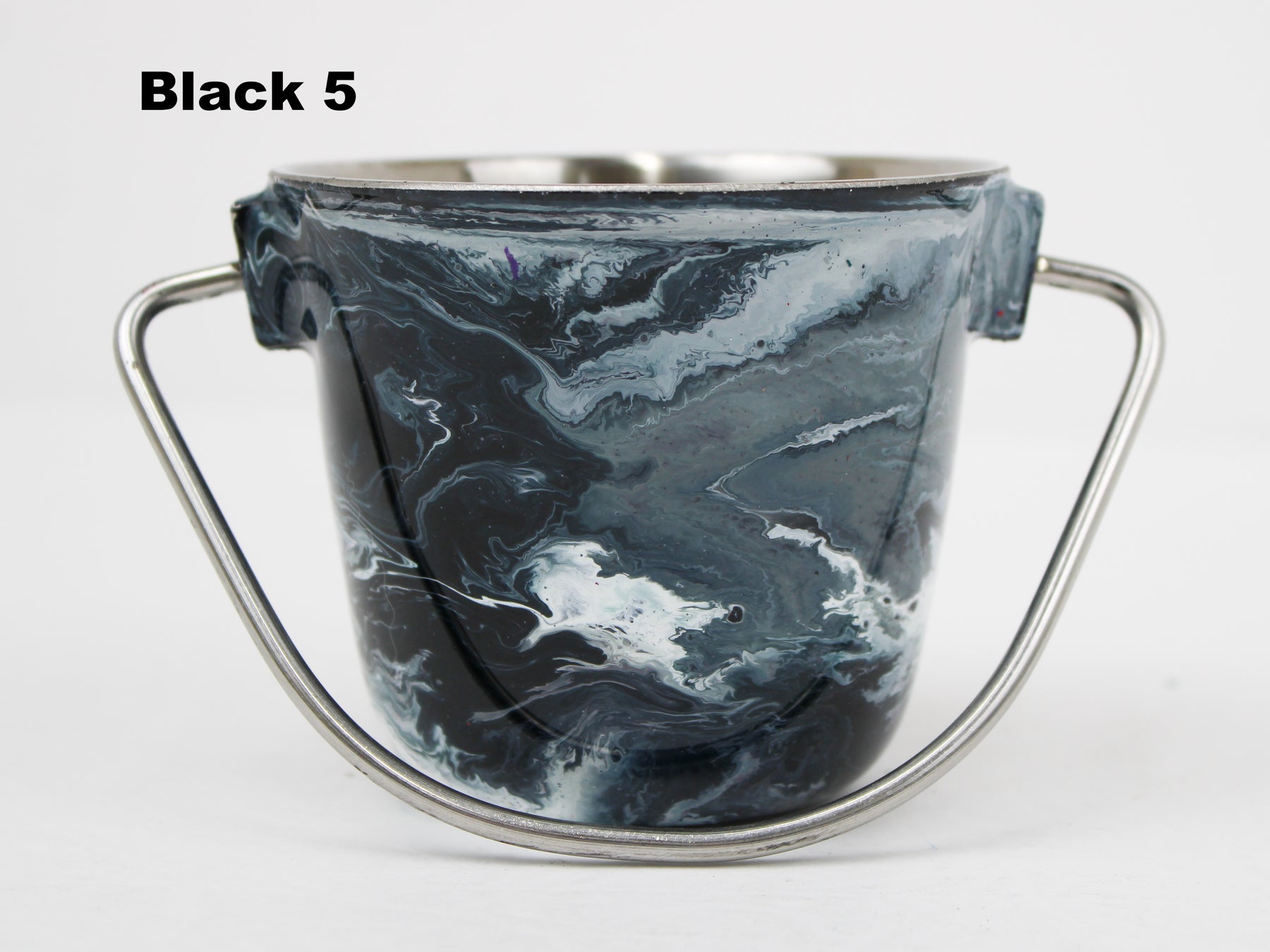 In stock Designer Water Buckets is handmade and truly one of a kind design, crafted with a durable epoxy finish that’s built to last. Created in Wisconsin by a retired veterinary technician, every item reflects skill, attention to detail, and a commitment to quality. To preserve its shine and longevity, each piece should be hand washed only.