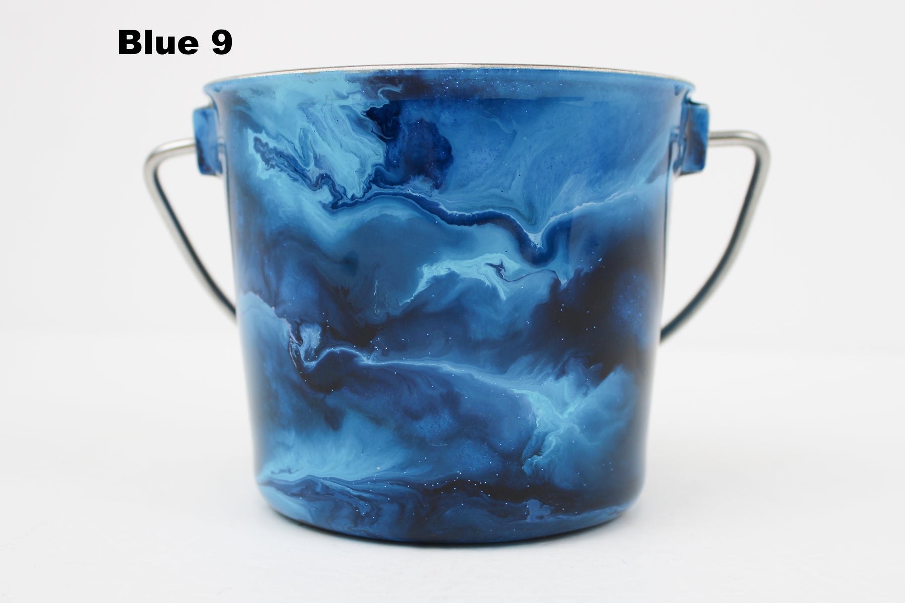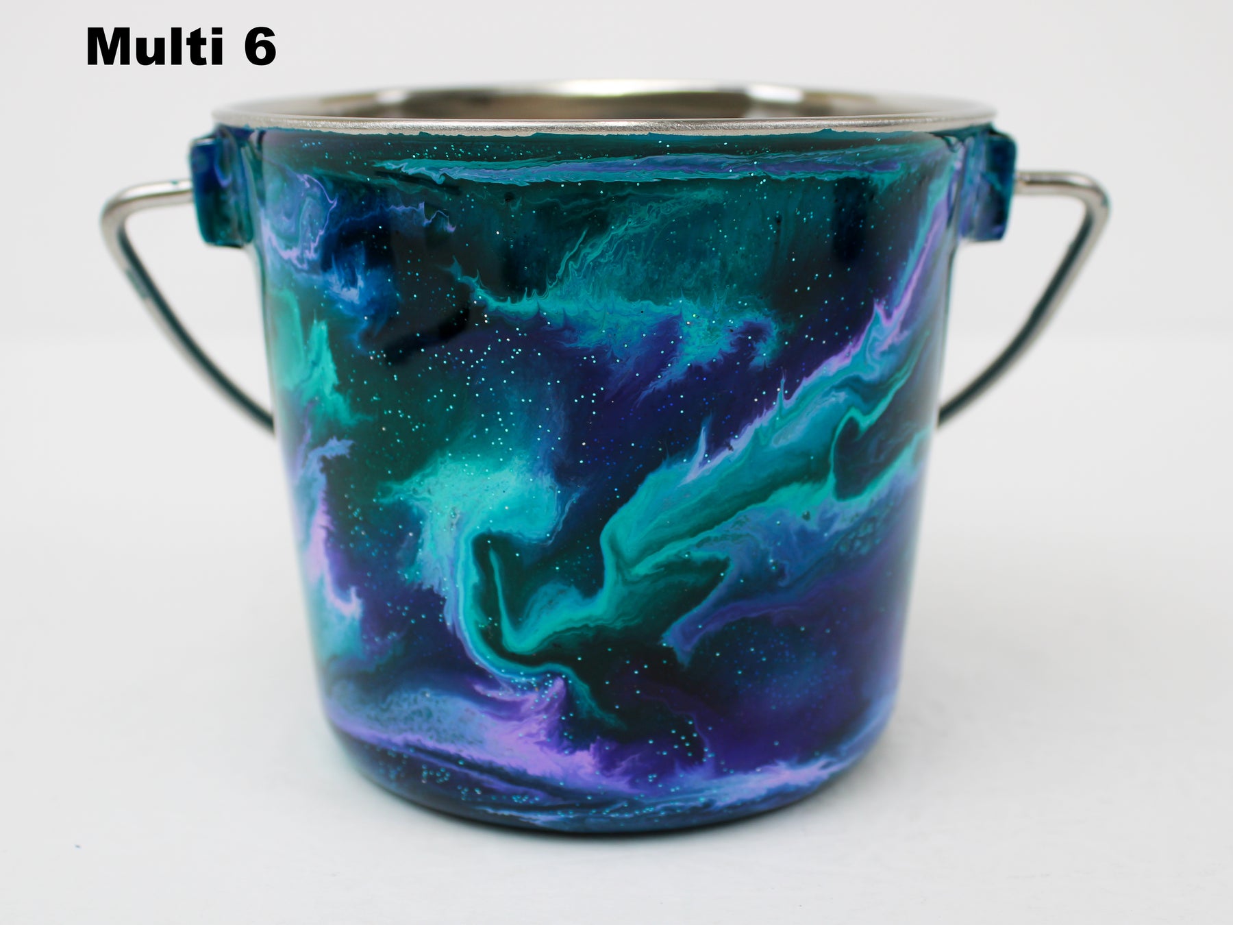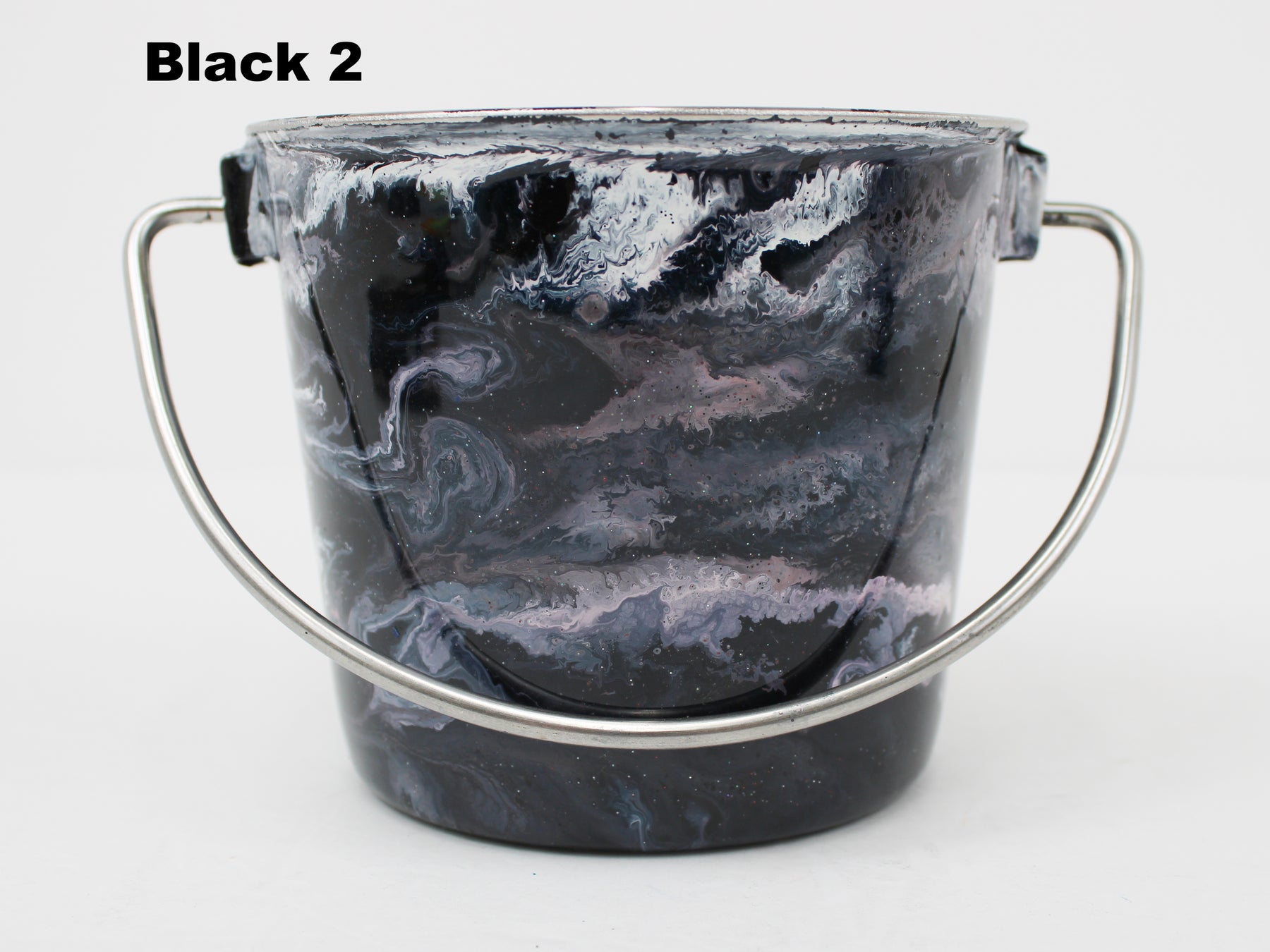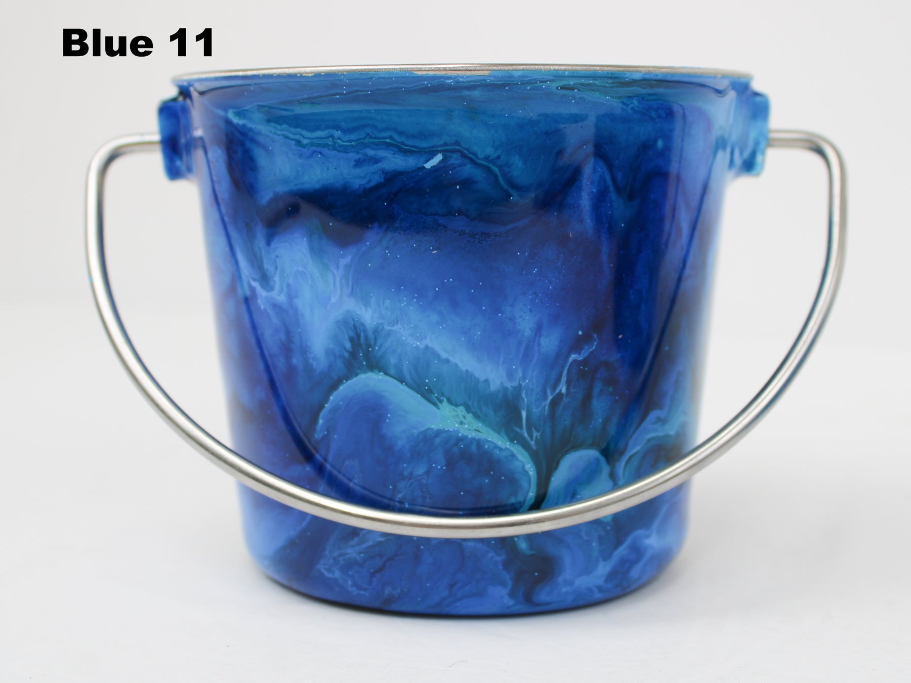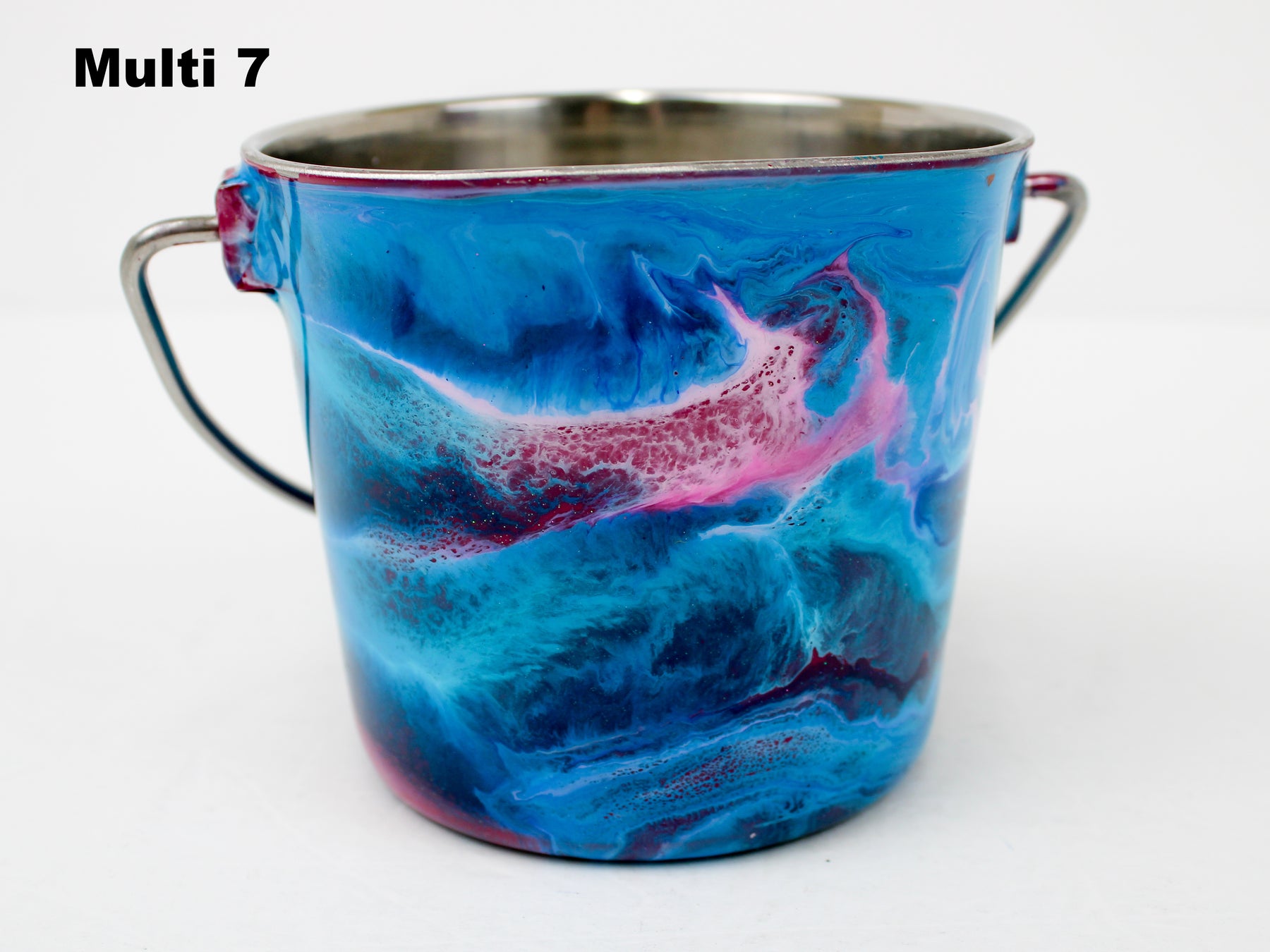 In stock Designer Water Buckets are handmade and each is truly a one of a kind design, crafted with a durable epoxy finish that’s built to last. Created in Wisconsin by a retired veterinary technician, every item reflects skill, attention to detail, and a commitment to quality. To preserve its shine and longevity, each piece should be hand washed only.