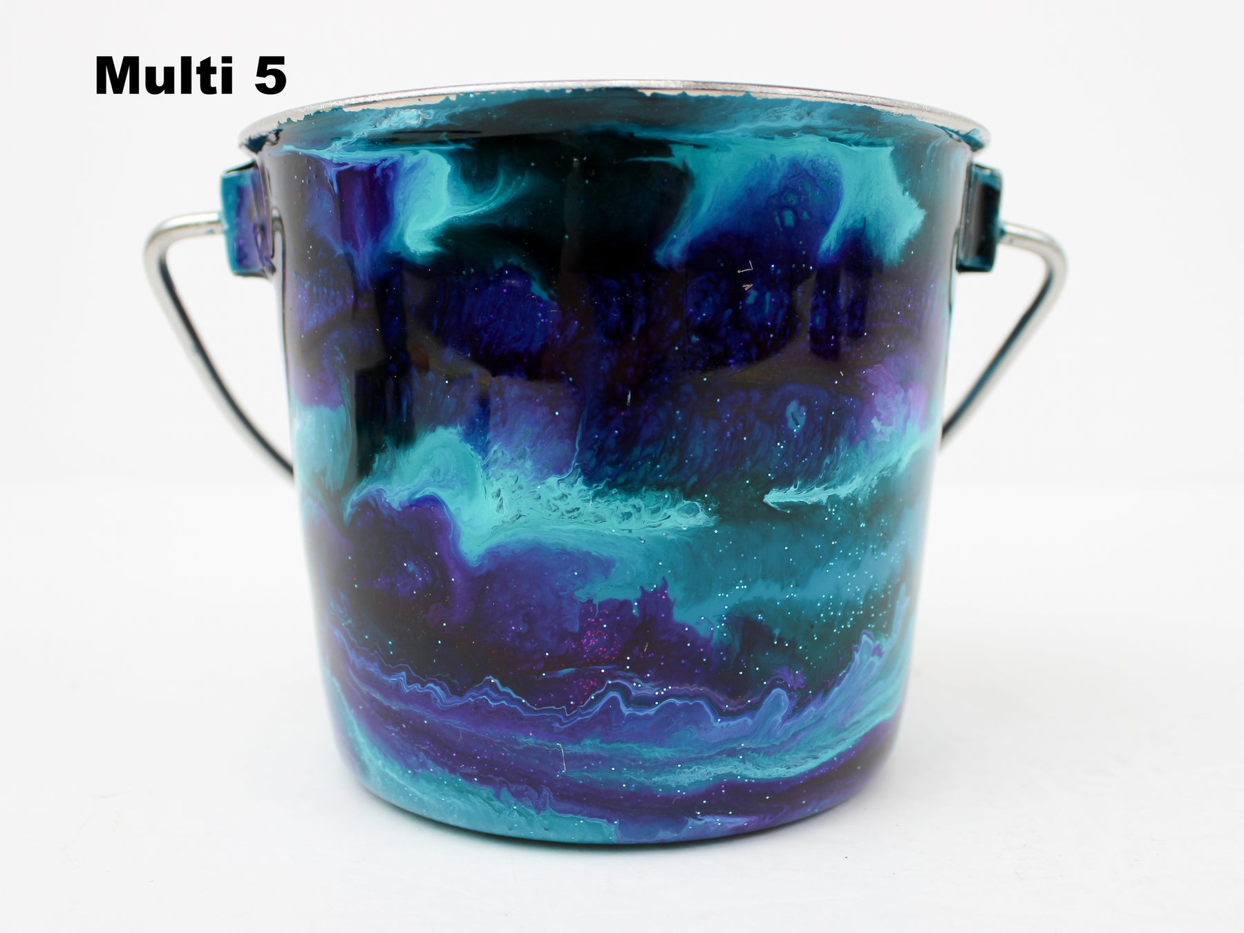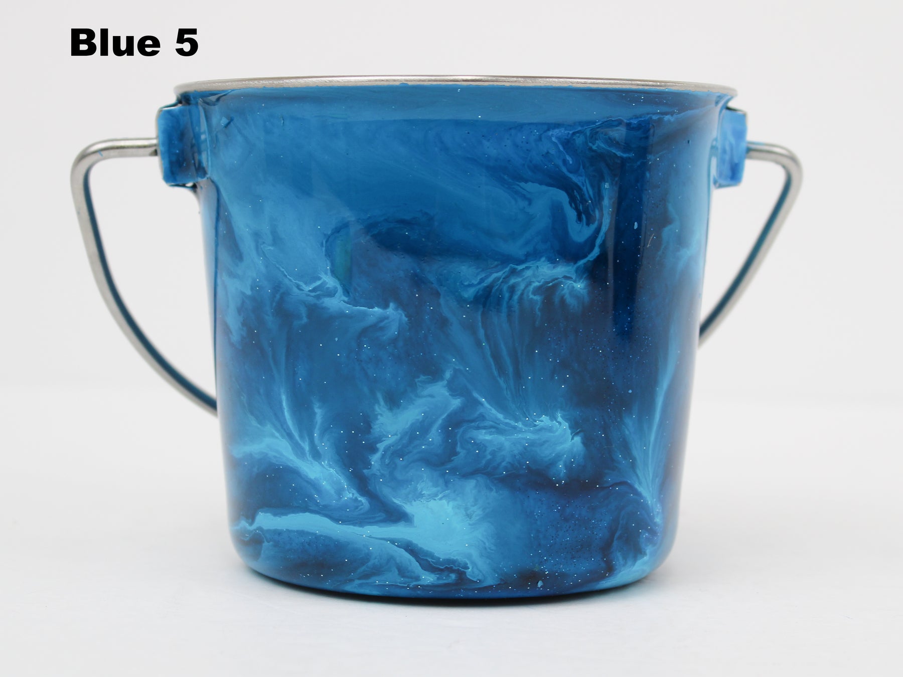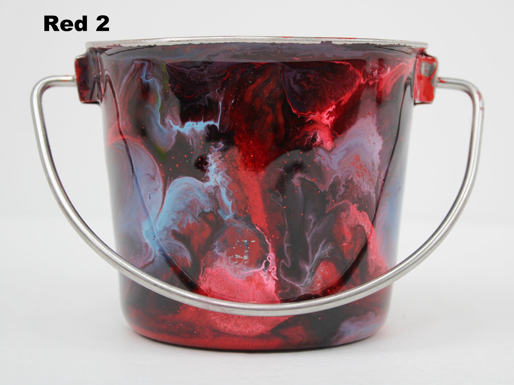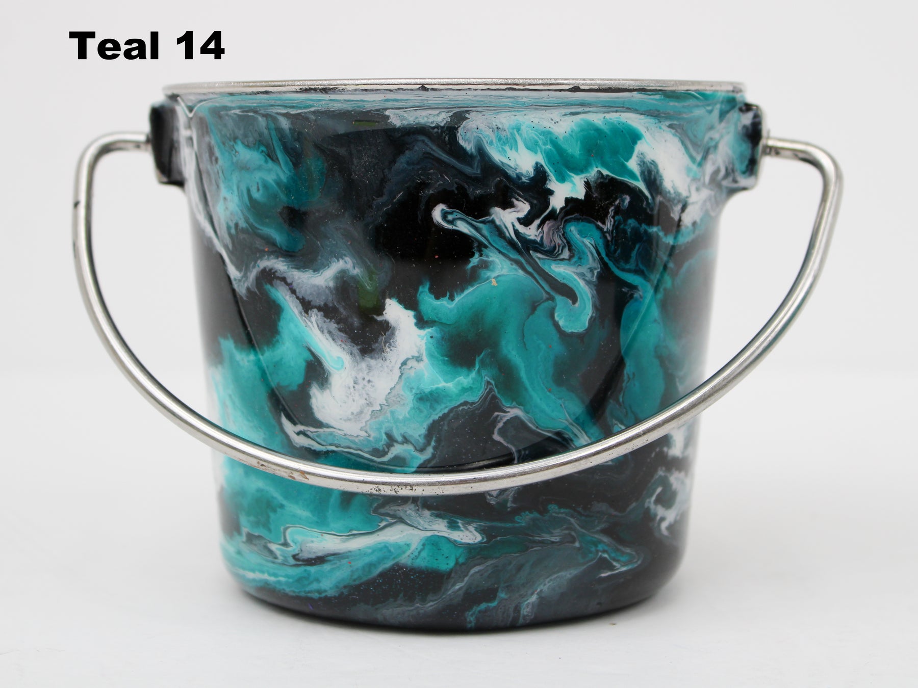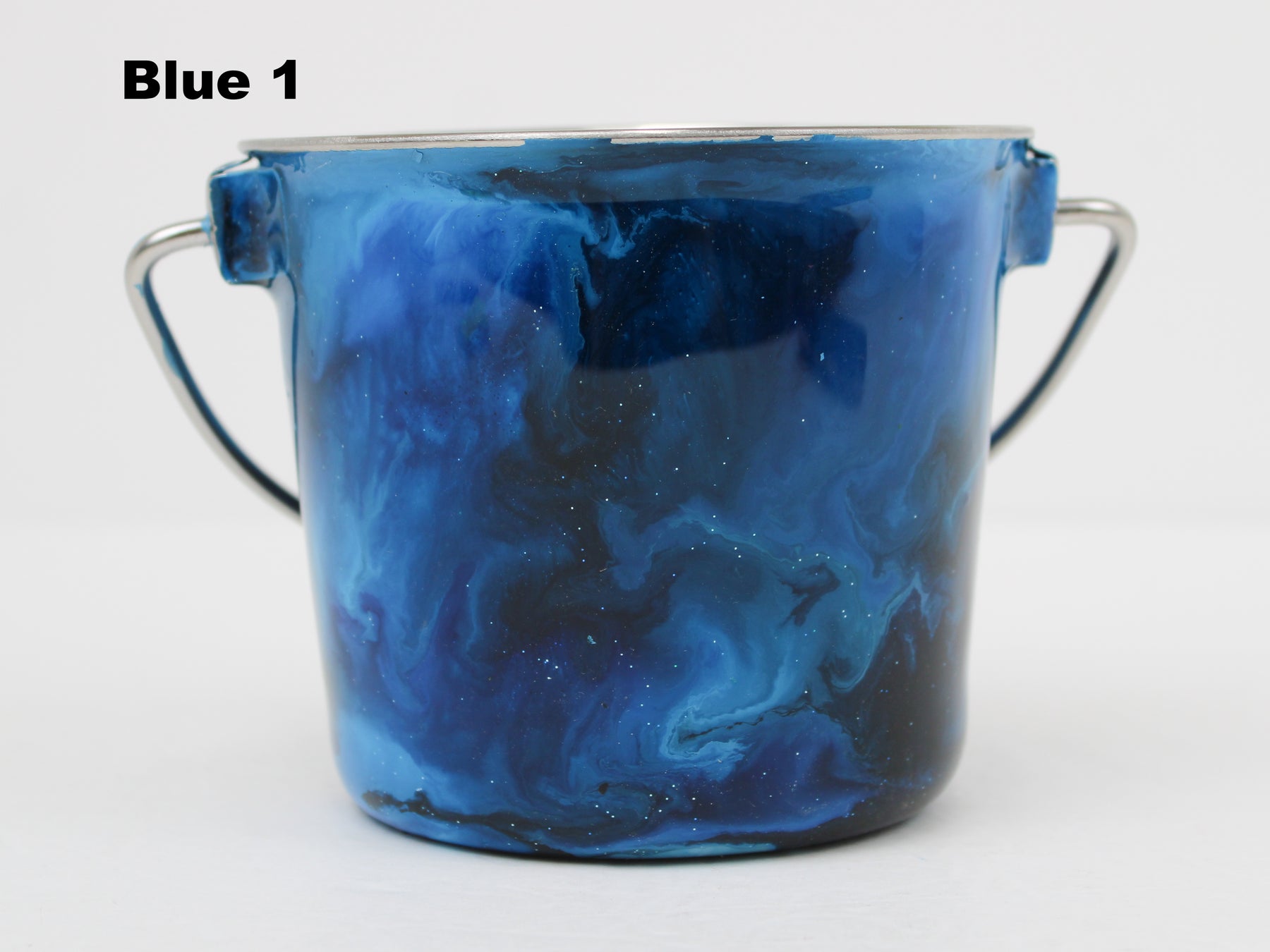 In stock Designer Water Buckets are handmade and each is truly a one of a kind design, crafted with a durable epoxy finish that’s built to last. Created in Wisconsin by a retired veterinary technician, every item reflects skill, attention to detail, and a commitment to quality. To preserve its shine and longevity, each piece should be hand washed only.